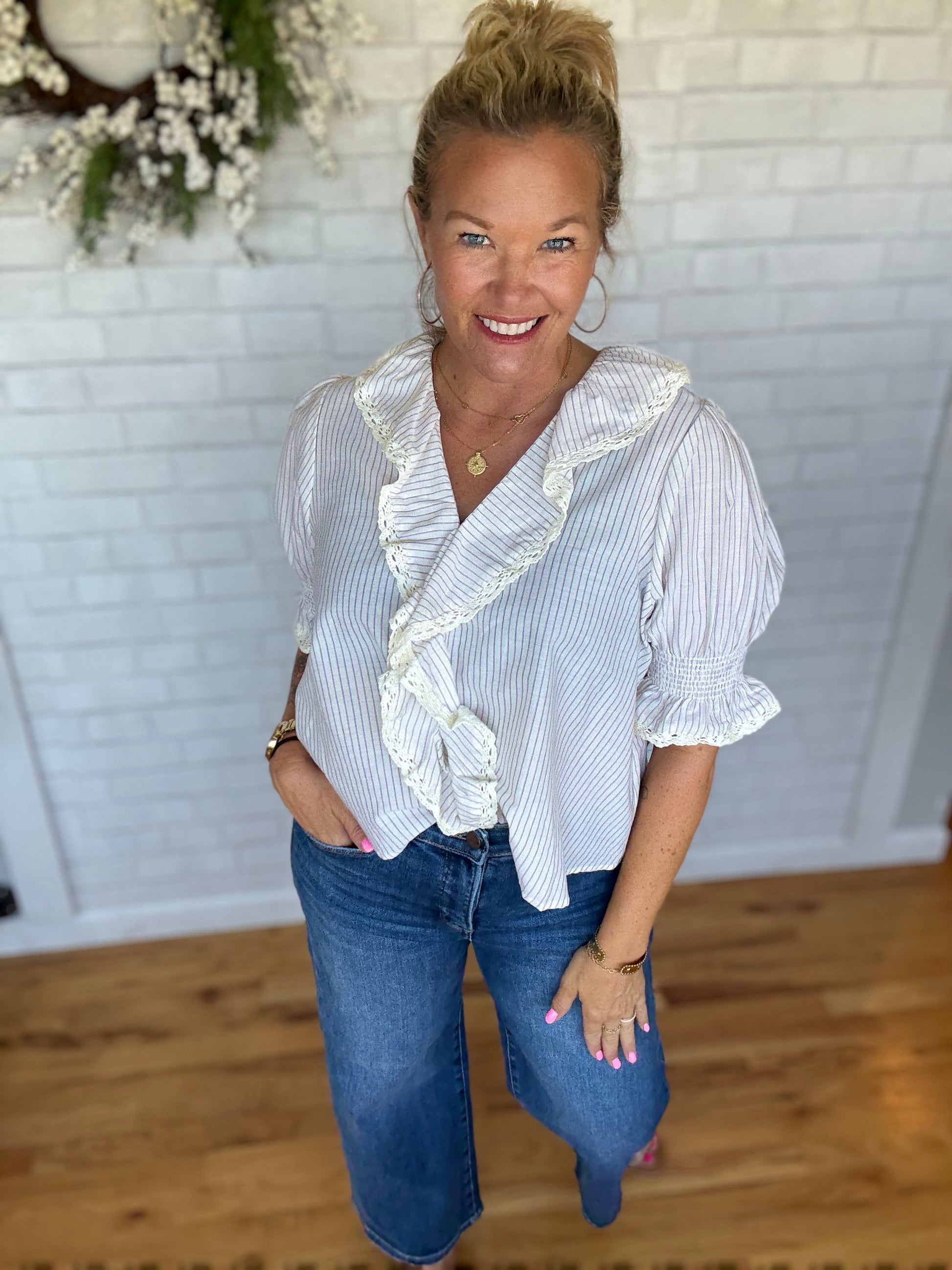 A pinstripe top with lace detail on the front and sleeves. This one has a longer sleeve. Fit is true to size. Fit is true to size.