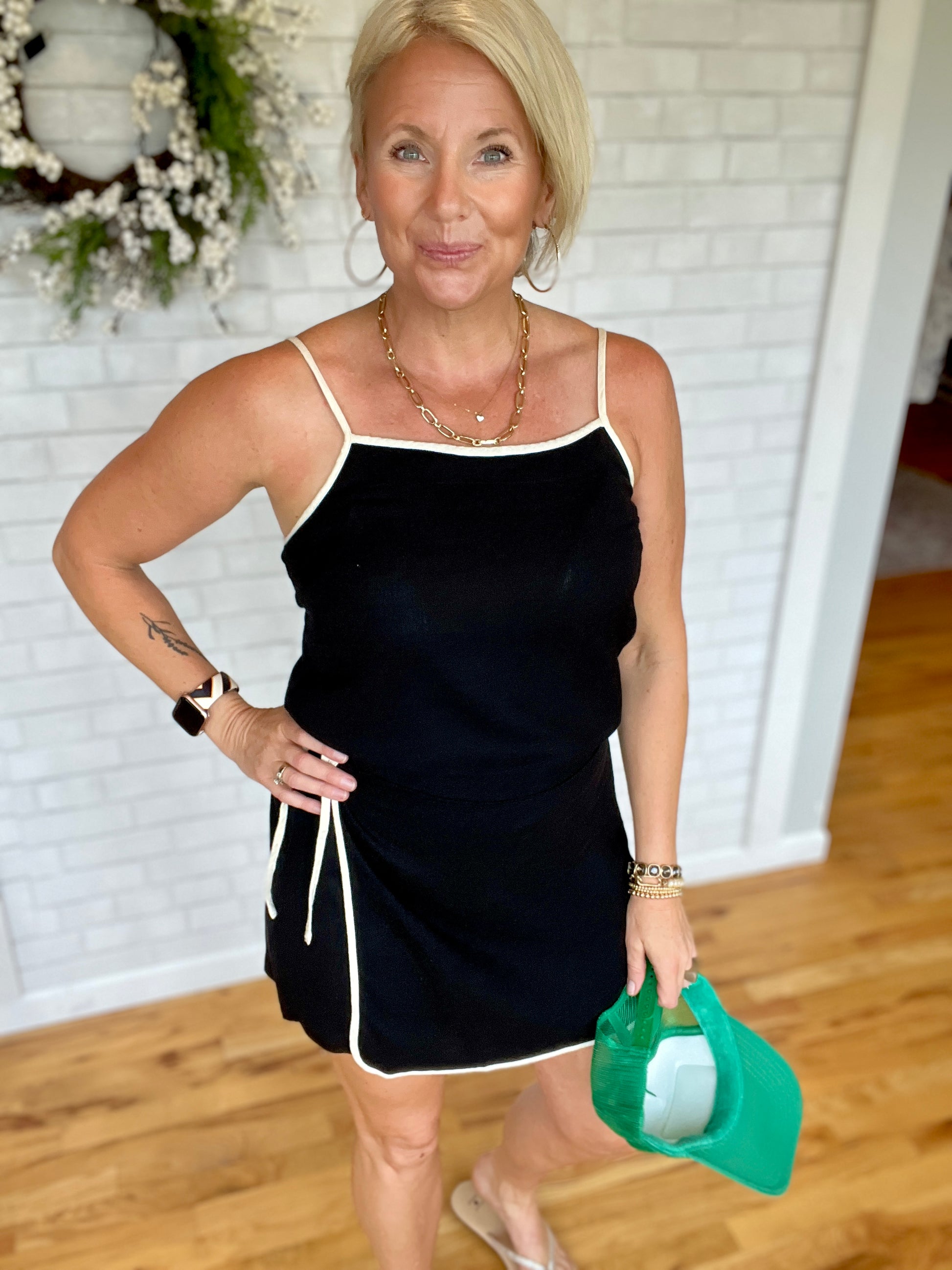 This is a fun wrap skirt - like the old scooter skirt look. The skirtpanel ties at the side waist; there are back pockets. Inseam is 3"; fit is true to size.