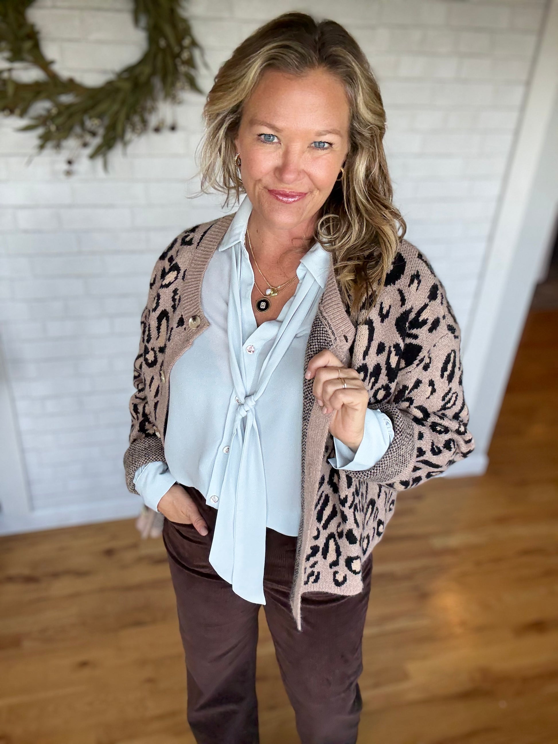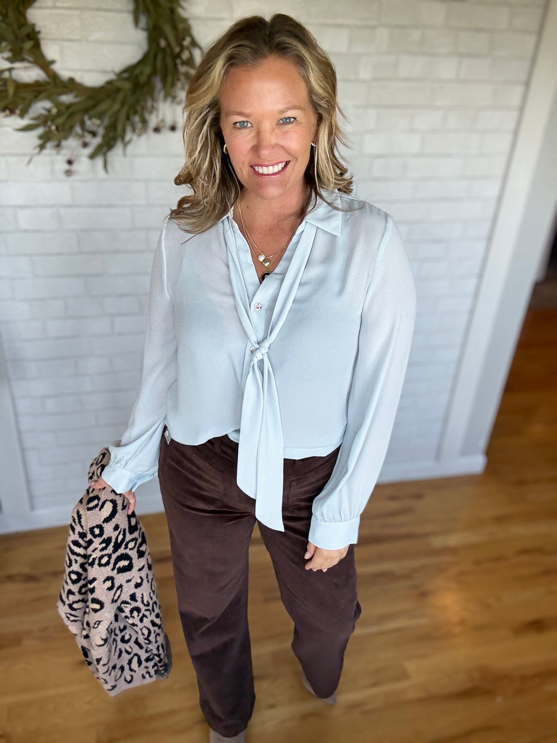 A light blue top with a detachable neck tie. This one has functional buttons that have pink flecking on them. Such a feminine top! This top does not have stretch. Fit is true to size.