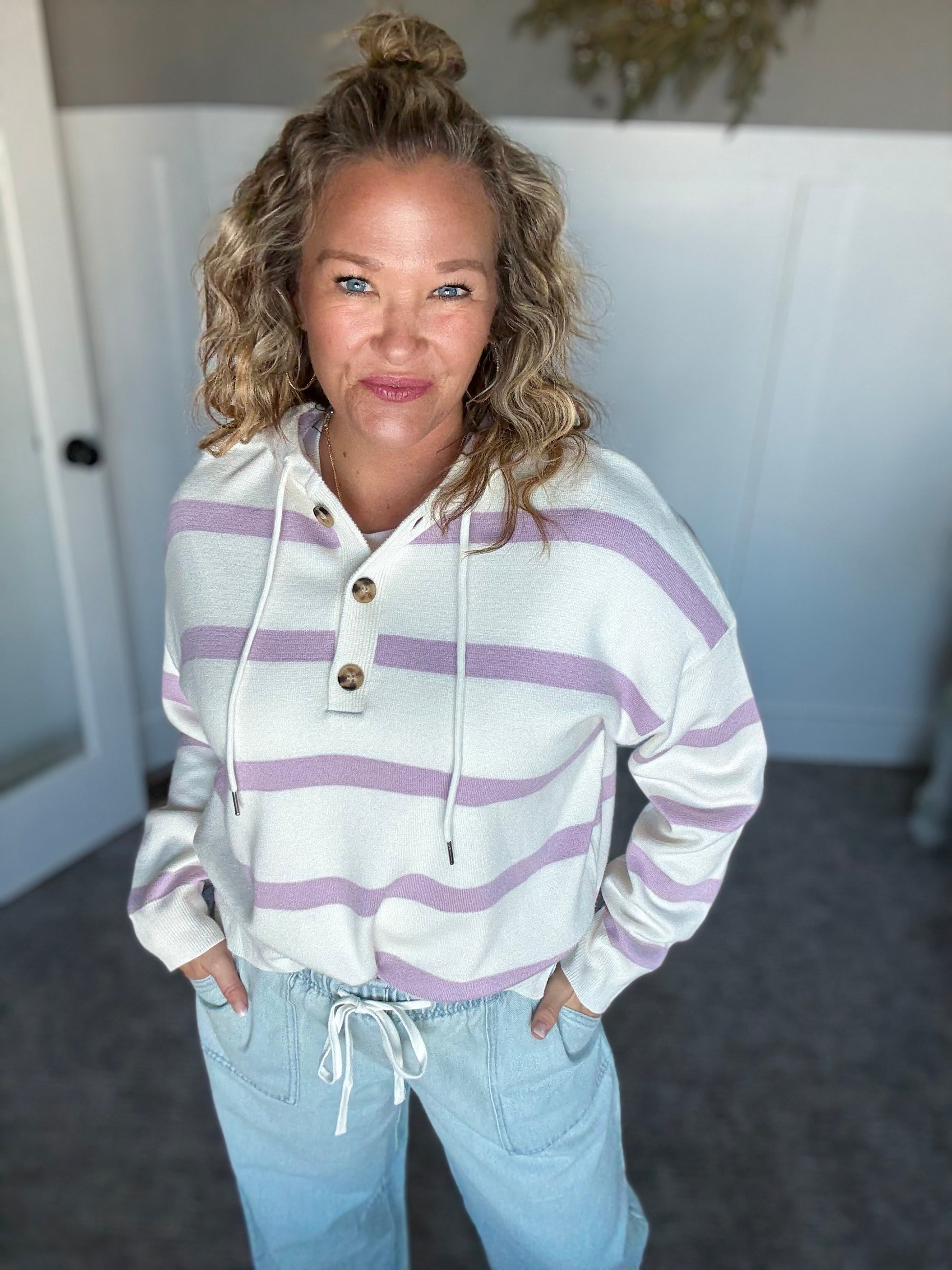 Soft as ever, this comfy pullover is featured in a cashmere blend knit with an attached hoodie and half button front design.