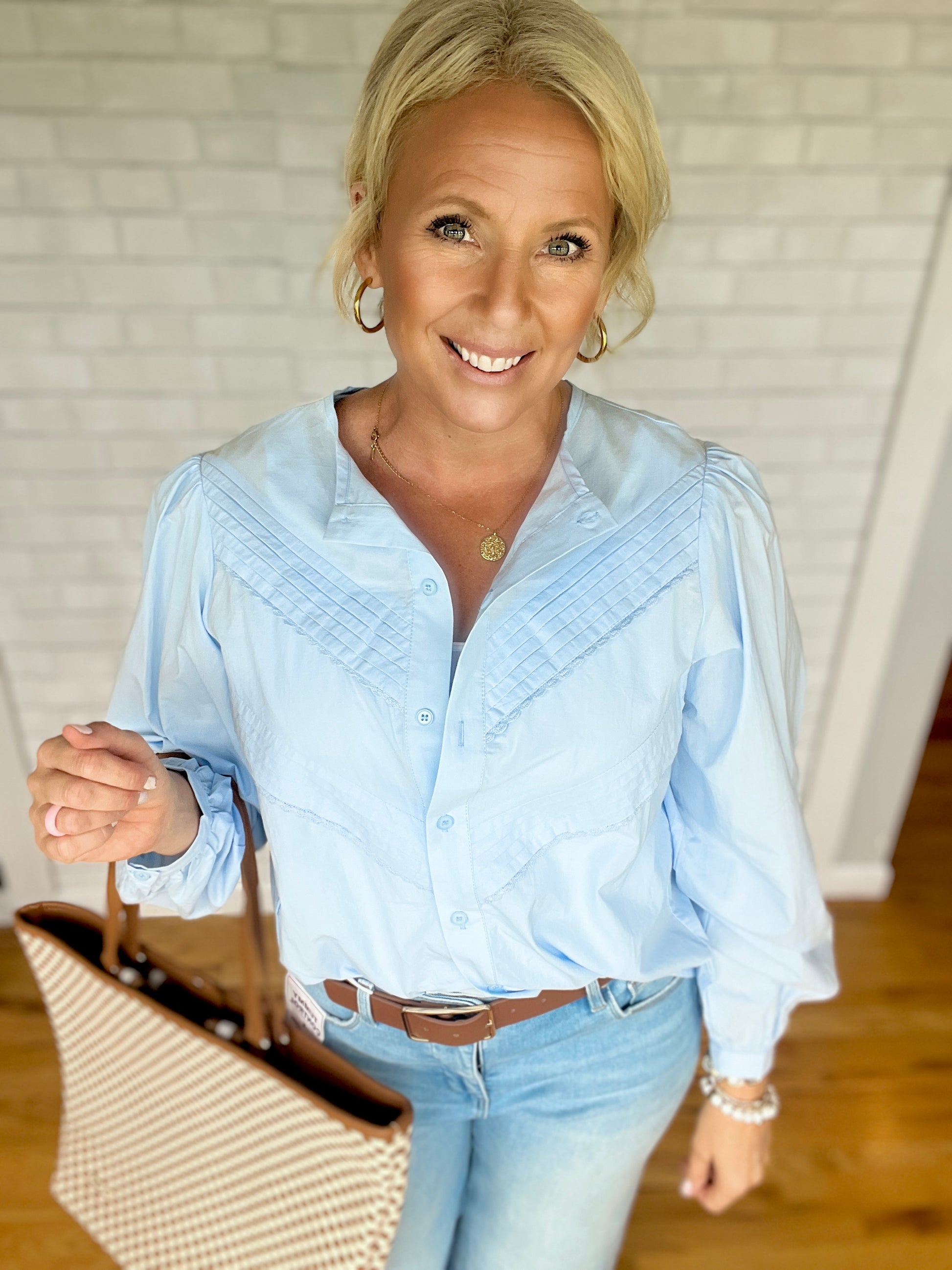 A white cotton pintuck blouse with functional buttons down the front. Fit is true to size.
