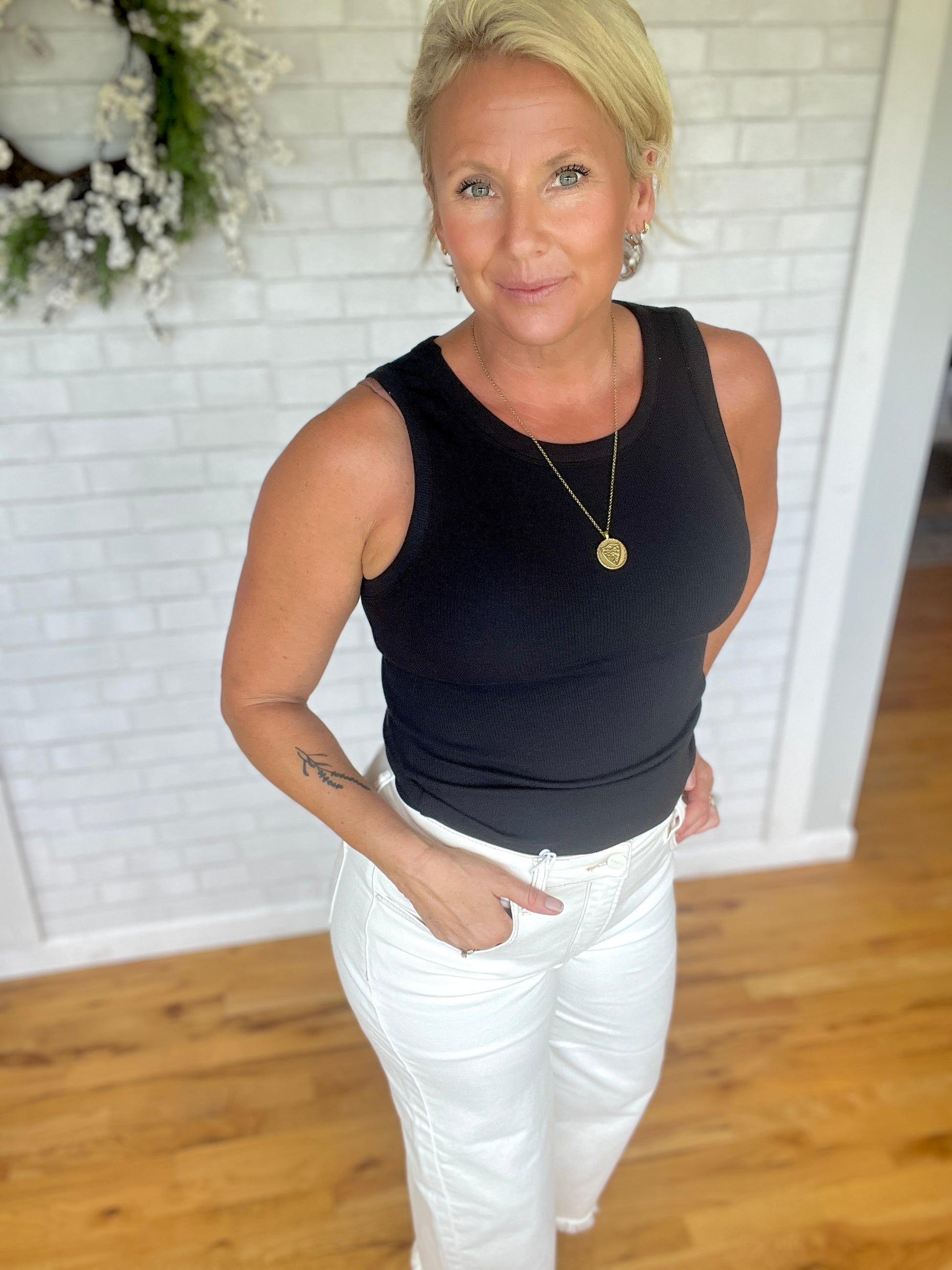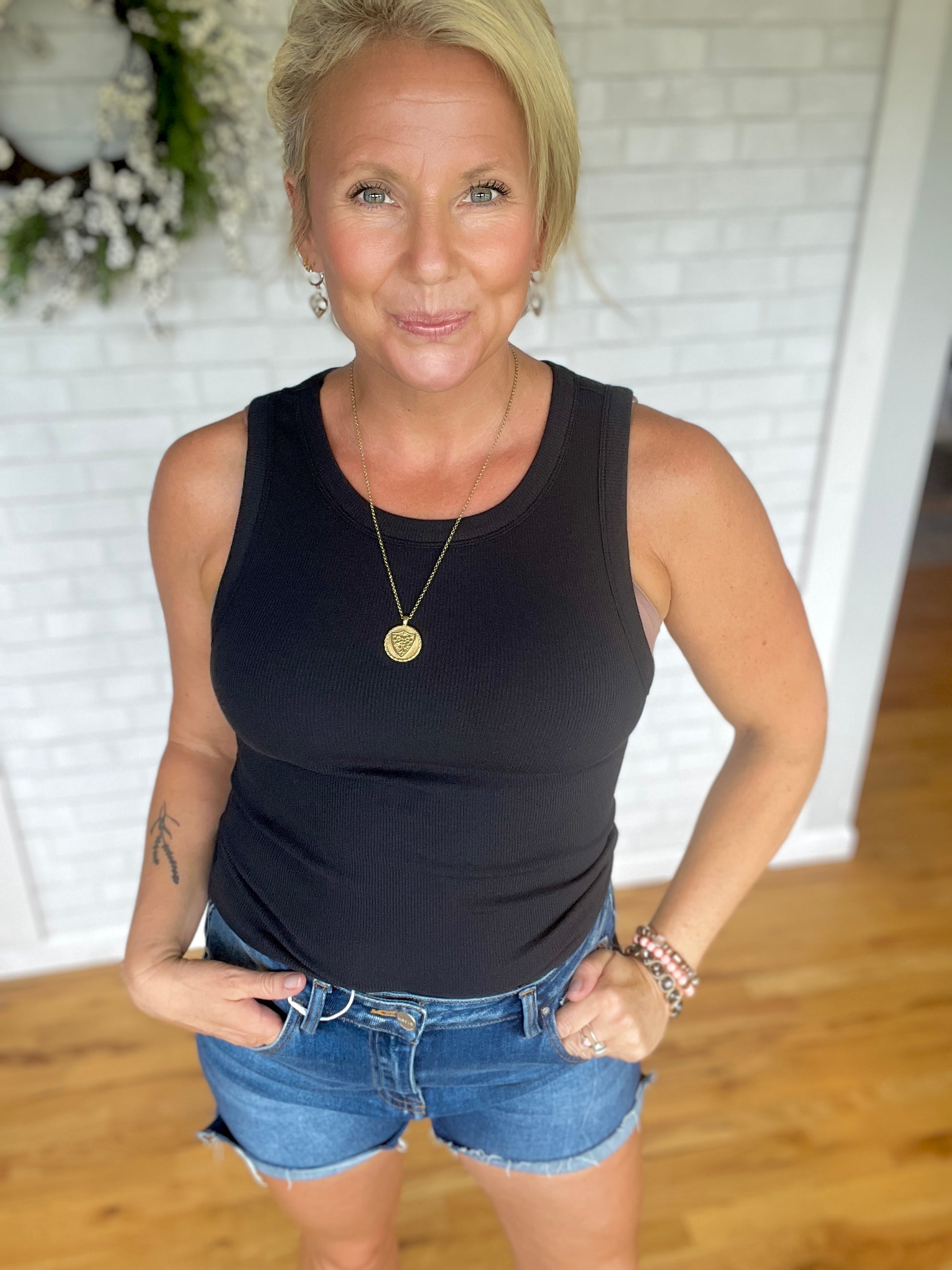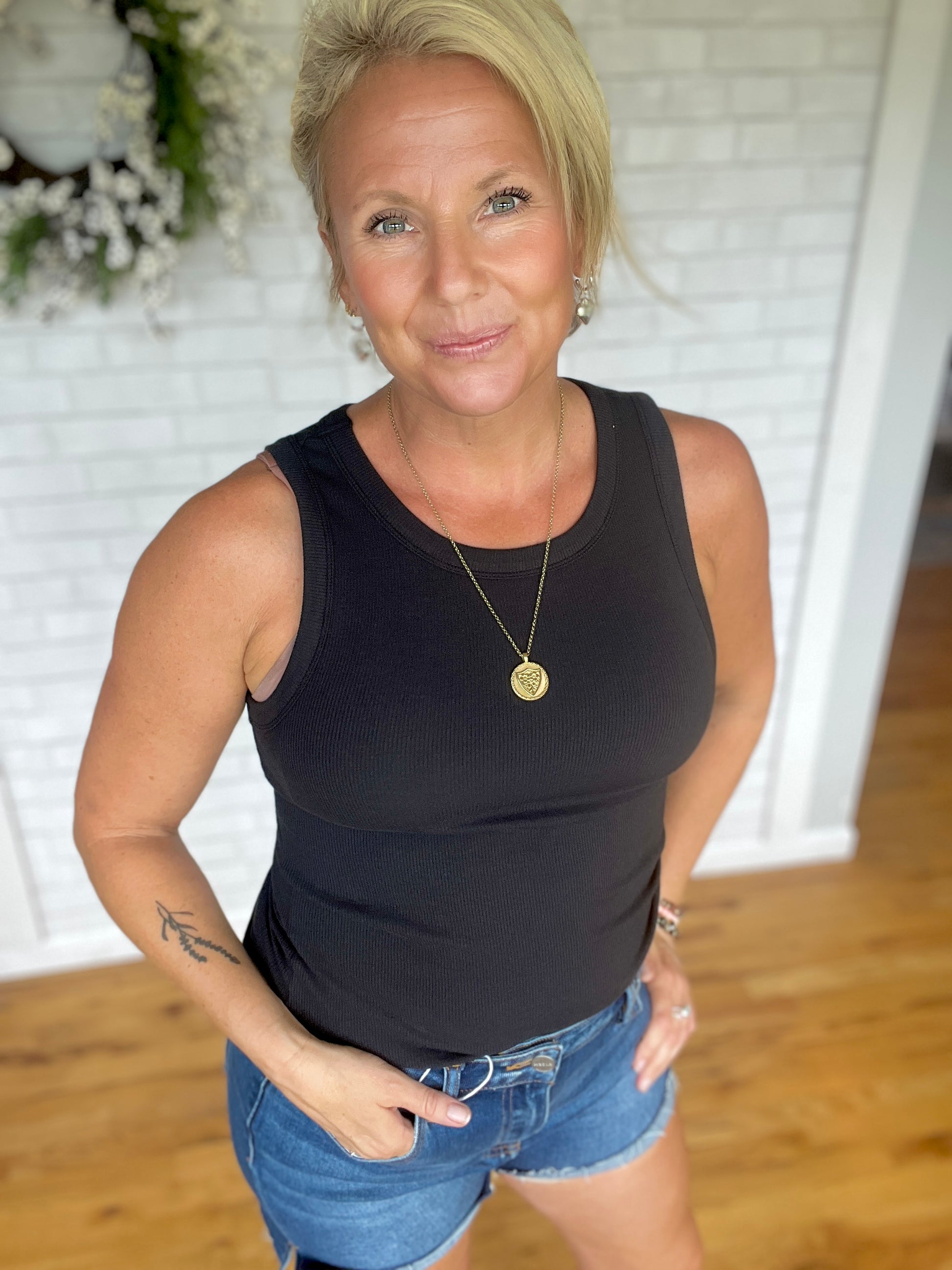 Who doesn't love a classic ribbed tank? It is micro-ribbed and bra friendly.This one fits close to the body so size up if you want a looser fit.