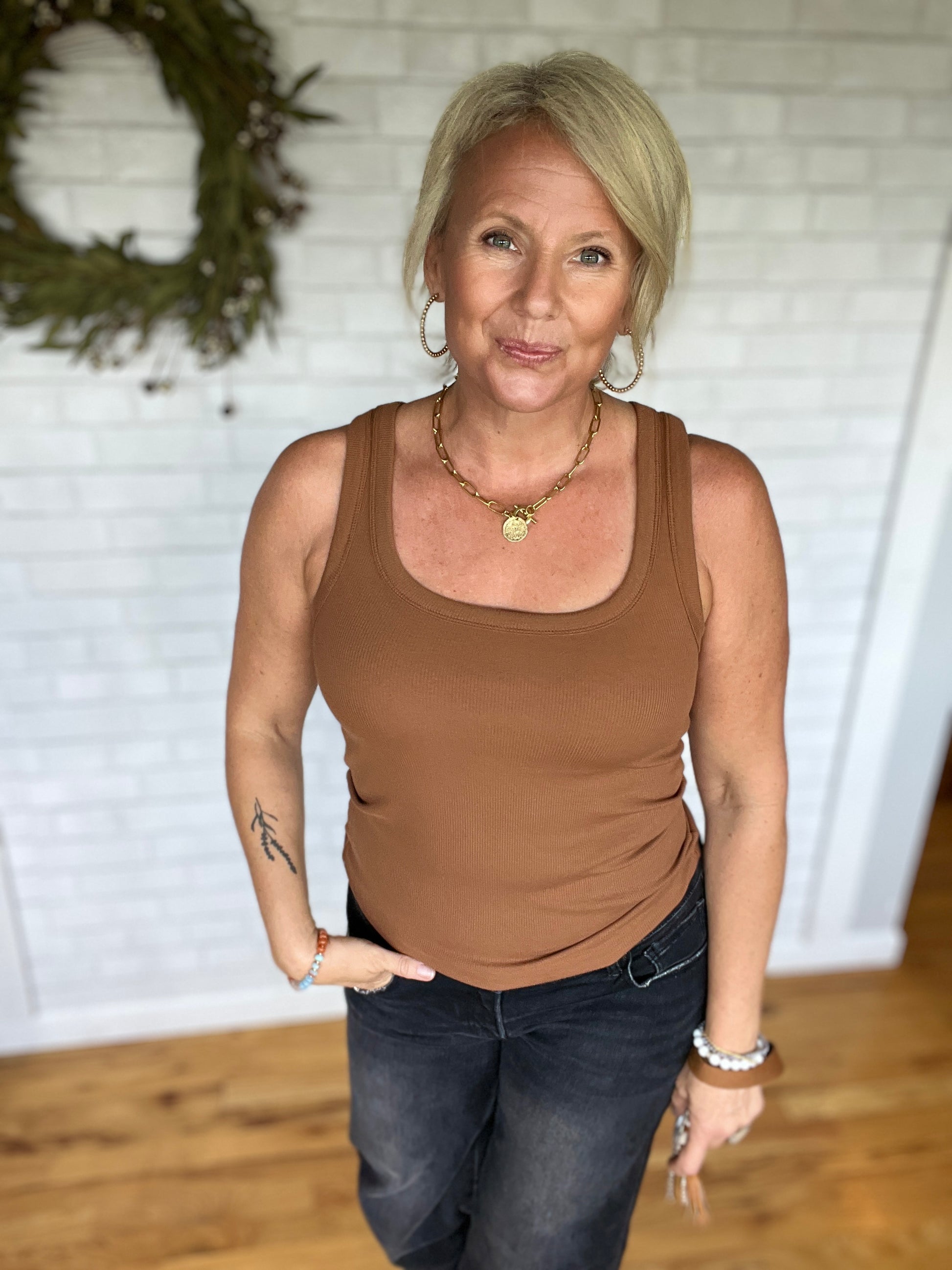 Who doesn't love a classic ribbed tank? It is micro-ribbed and bra friendly.This one fits close to the body so size up if you want a looser fit.