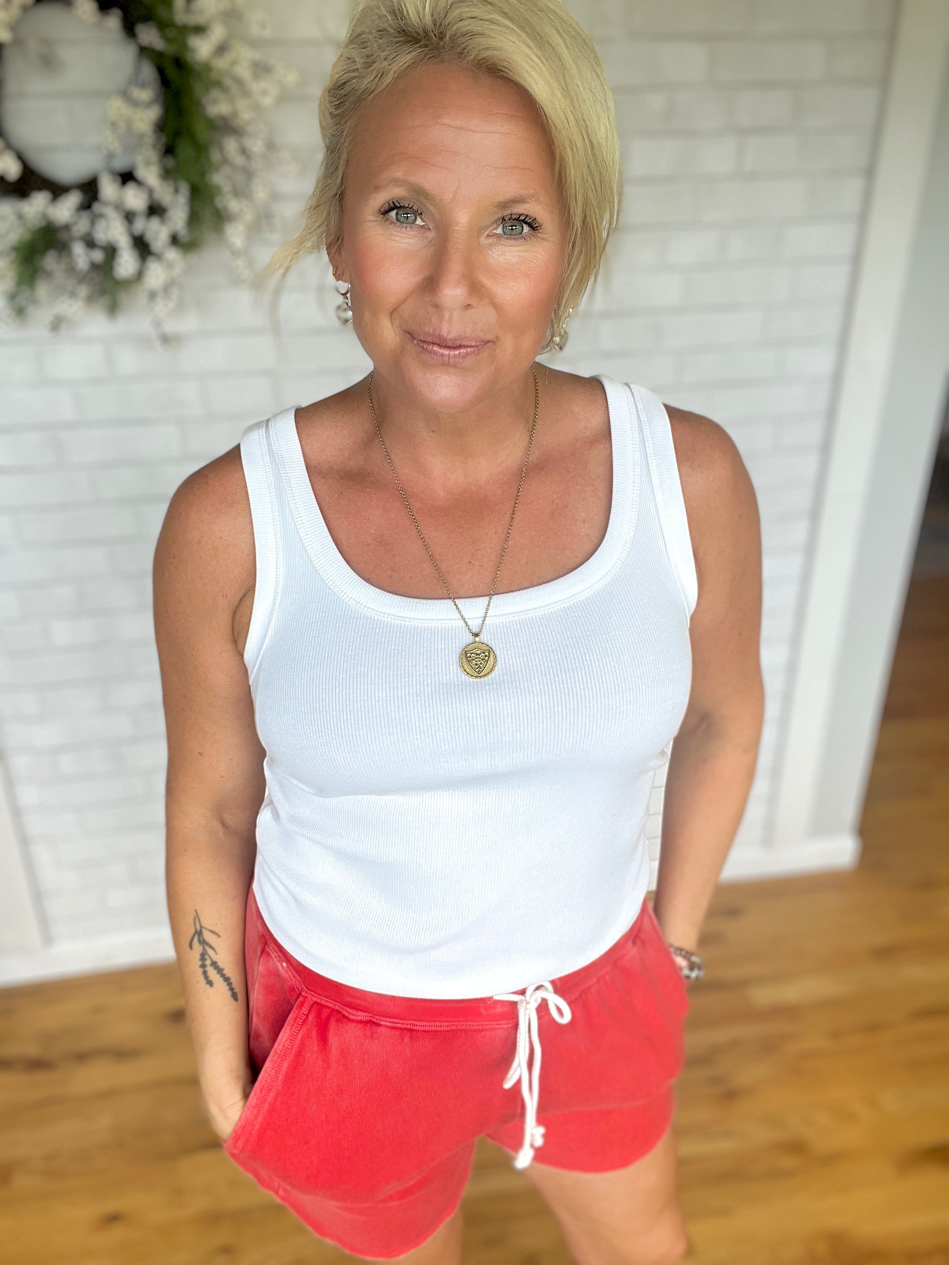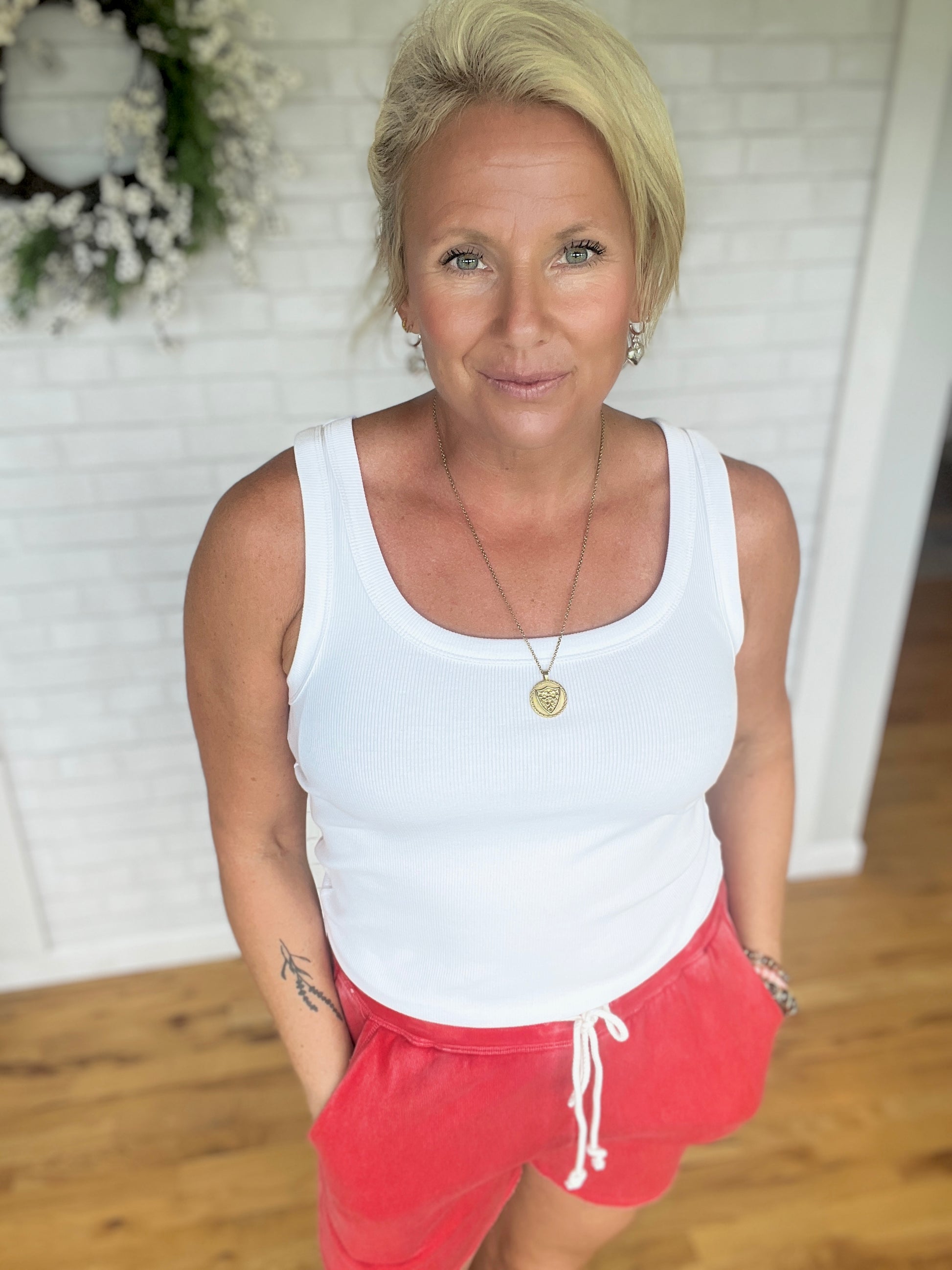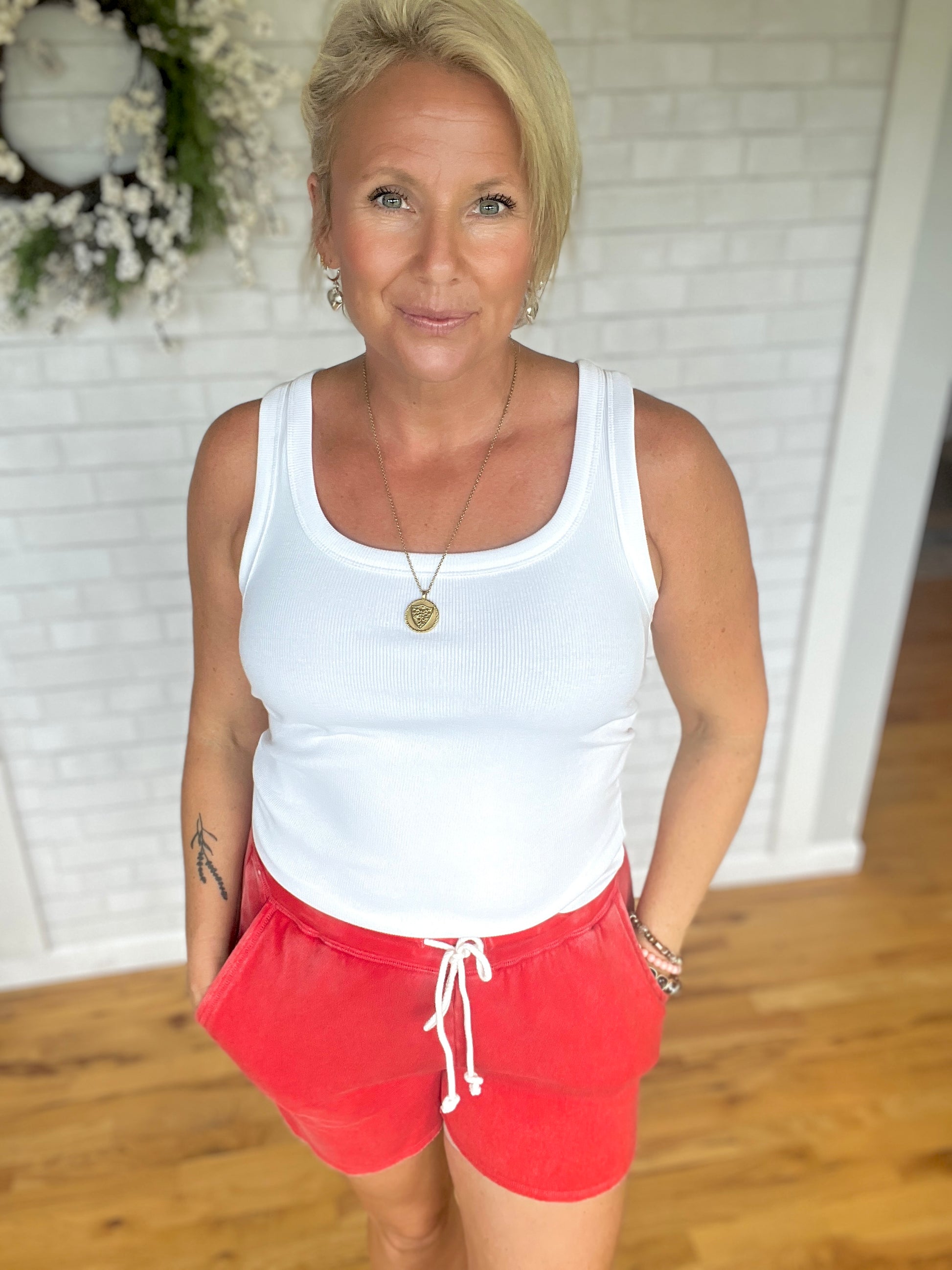 Who doesn't love a classic ribbed tank? It is micro-ribbed and bra friendly.This one fits close to the body so size up if you want a looser fit.