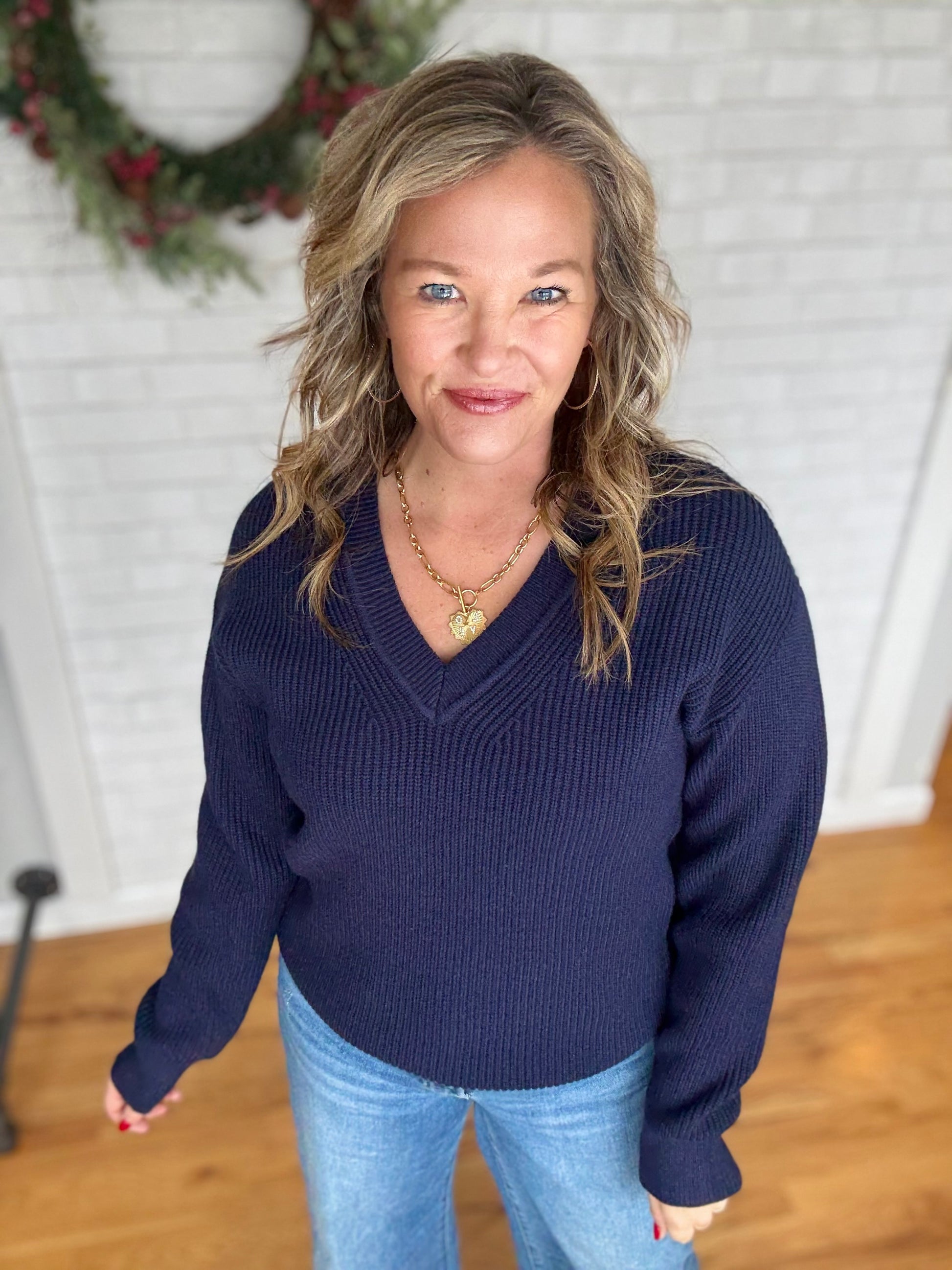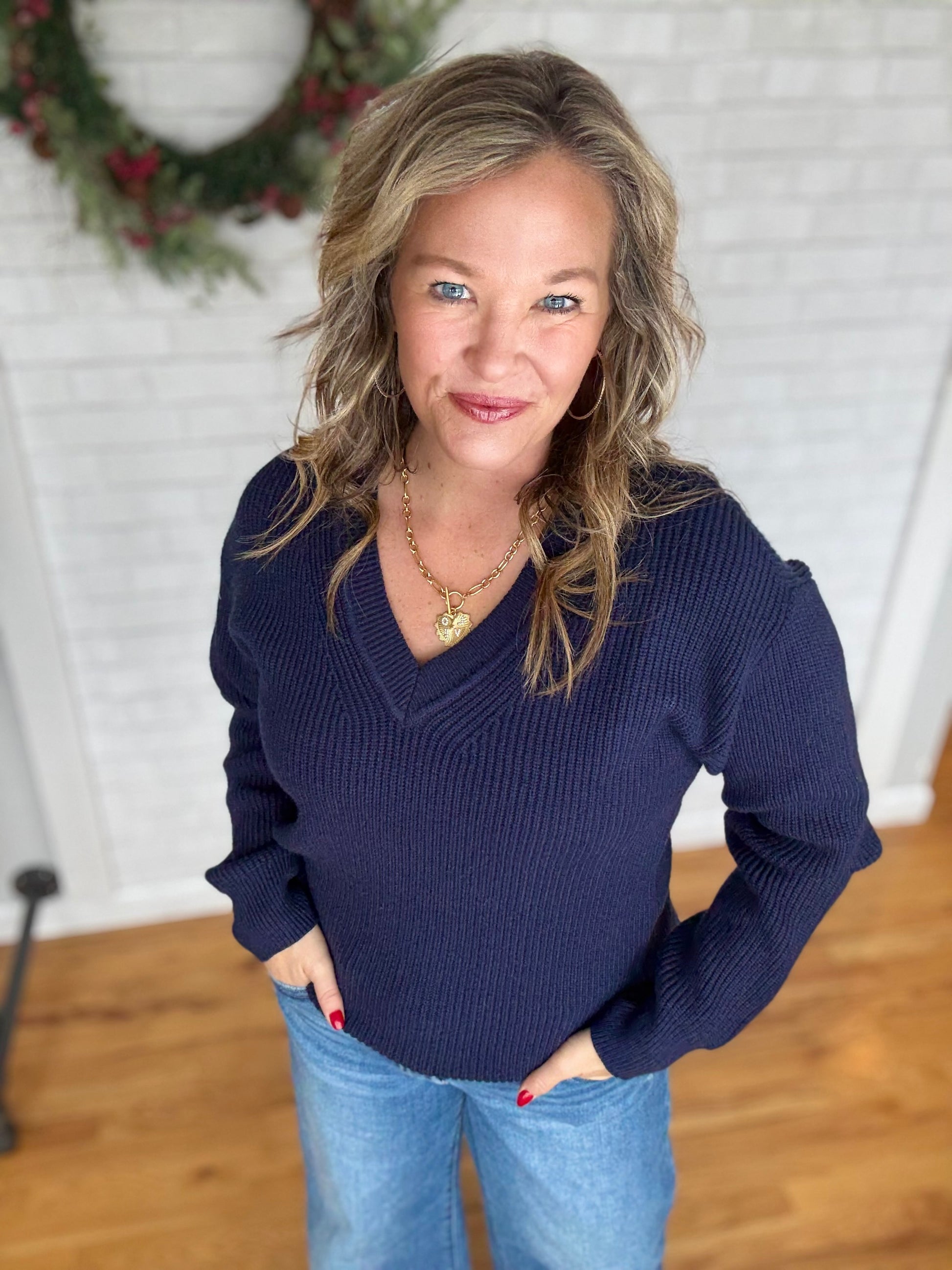 This cozy staple sweater is featuring a slouchy drop shoulder, v neckline and ribbed knit fabrication. Knit sweater & V neckline.