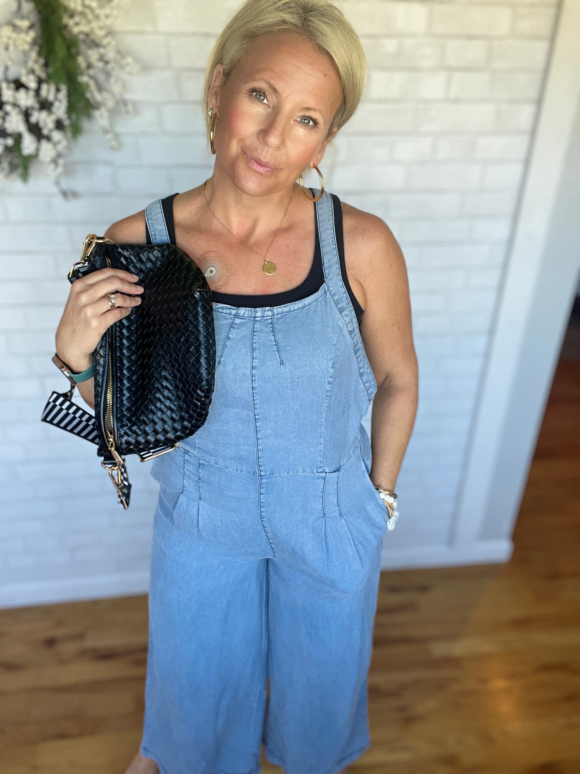 A tencel denim front tie dart overall. This one has a wide leg at the bottom with a dart seam on the front. Adjustable straps on the back. Fit is true to size.