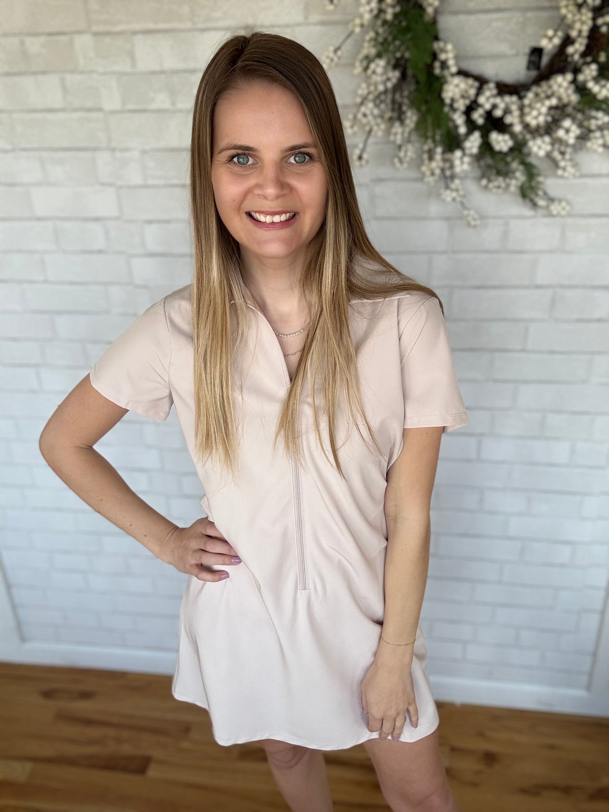 This is so reminiscent of a 60's flight attendant outfit. It zips up the front from waist to neck, has a wing collar and a modified a-line shape. The dress is lined and with shorts. Fit is true to size.