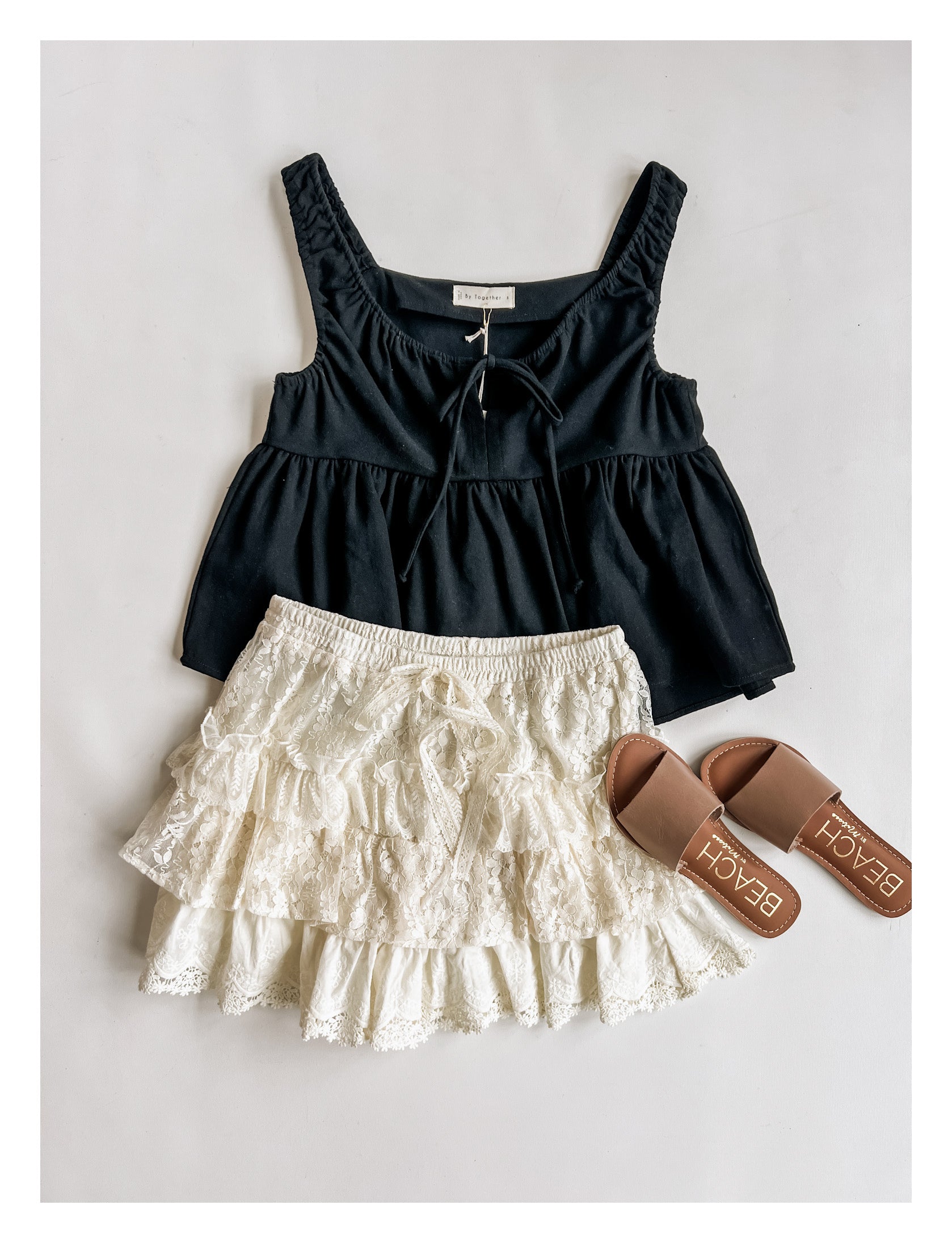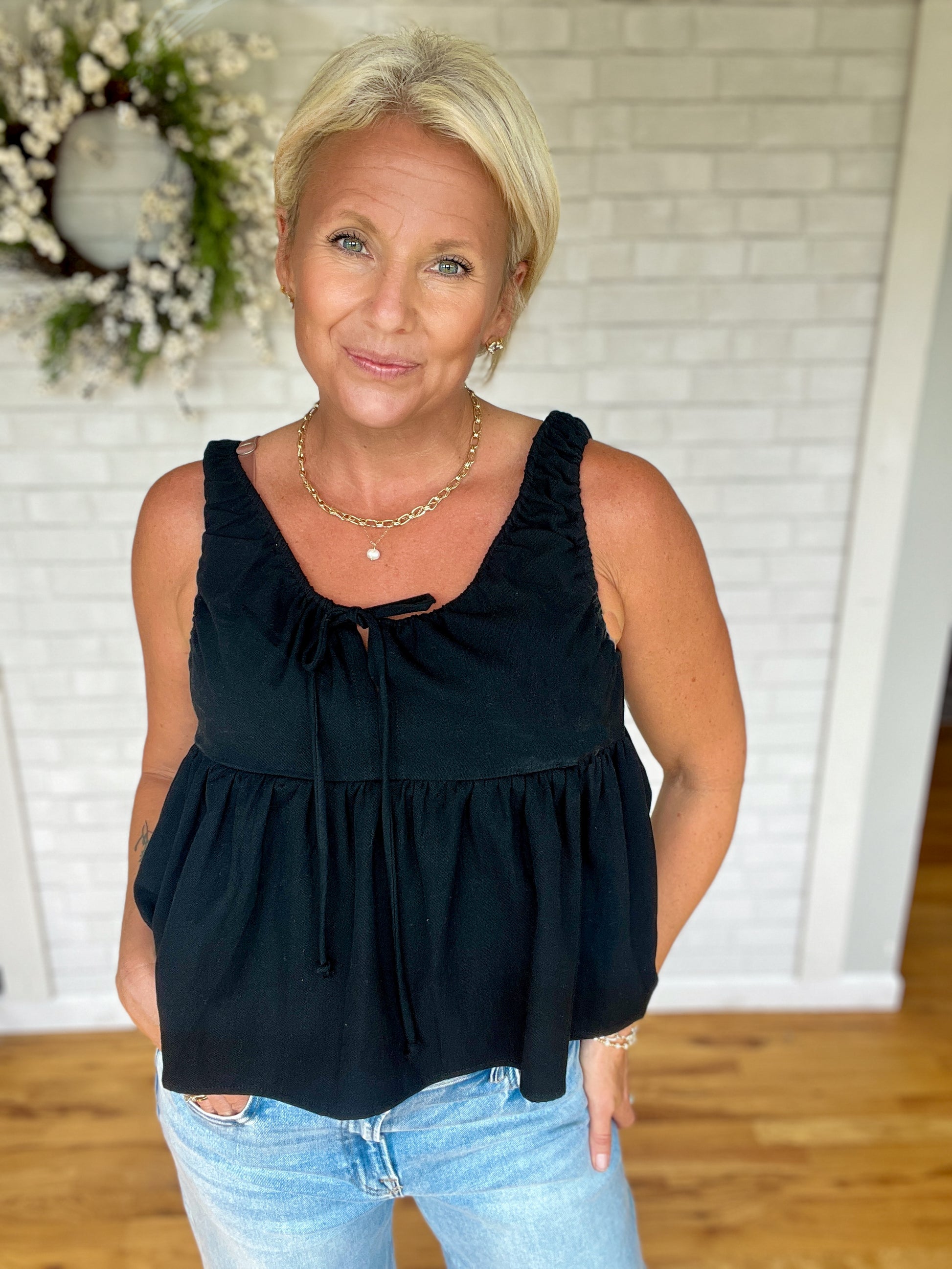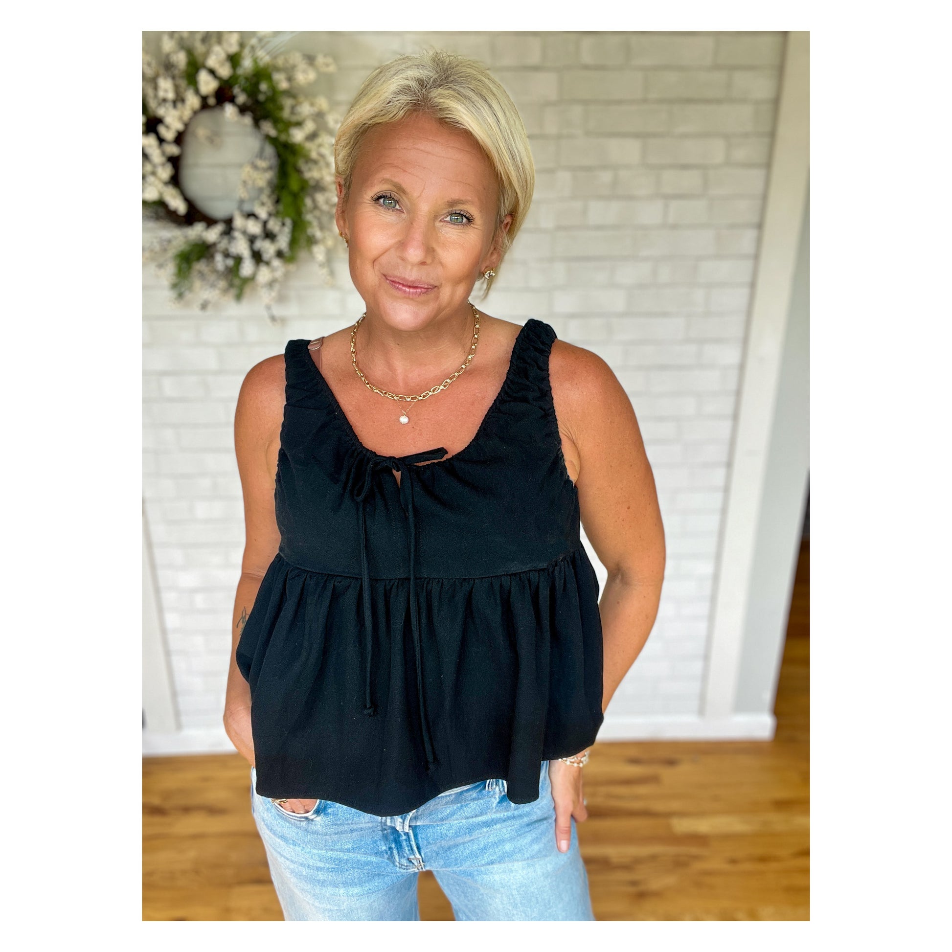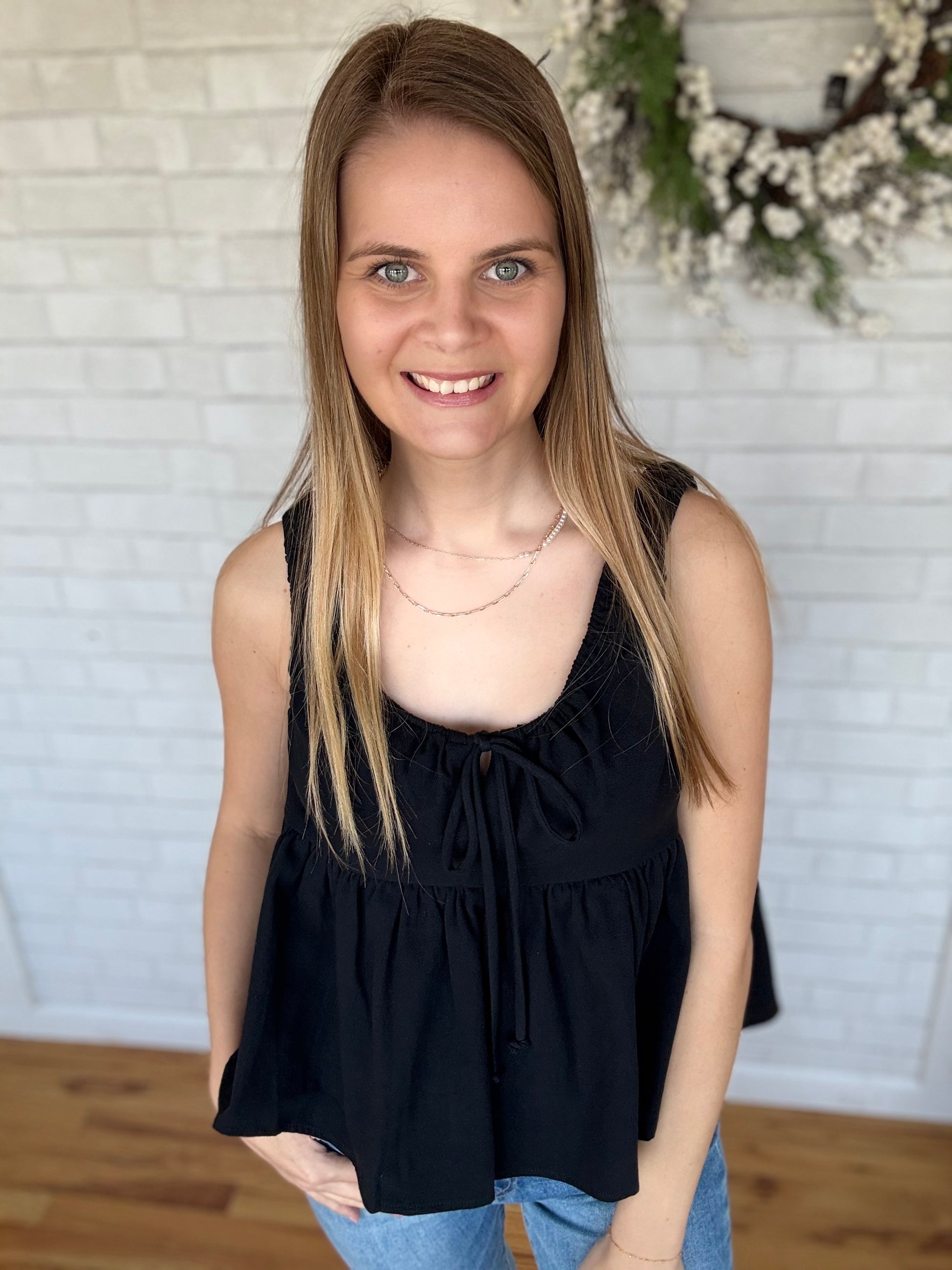 A cute black tank with lots of detail. A slight puff sleeve, a tie in the front and a tiered bottom. Fit is true to size.