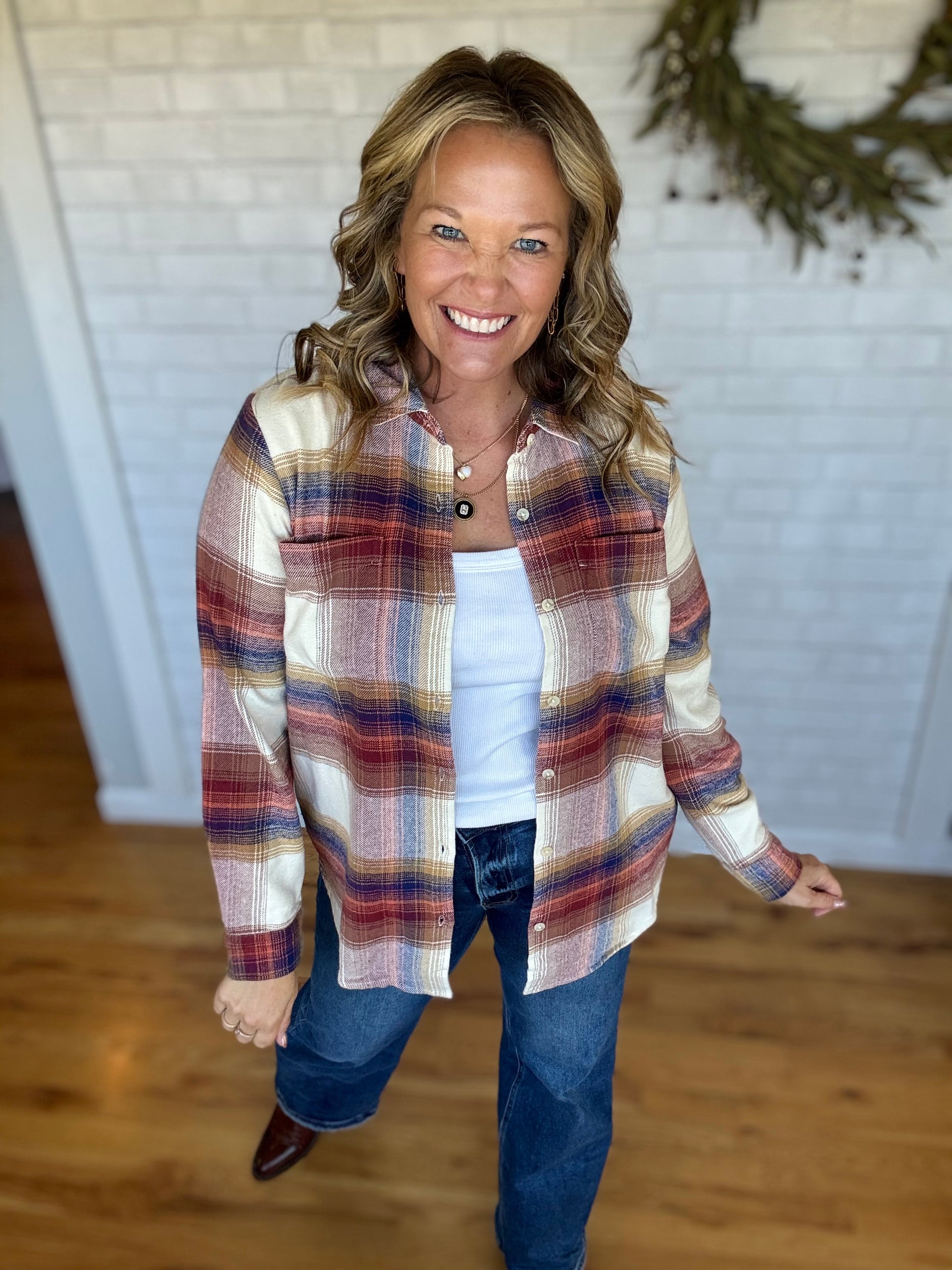 A plaid button downs shirt with colors of burnt red throughout! A perfect layering piece or wearing it on its own! This one has pockets on the side. Fit is true to size.