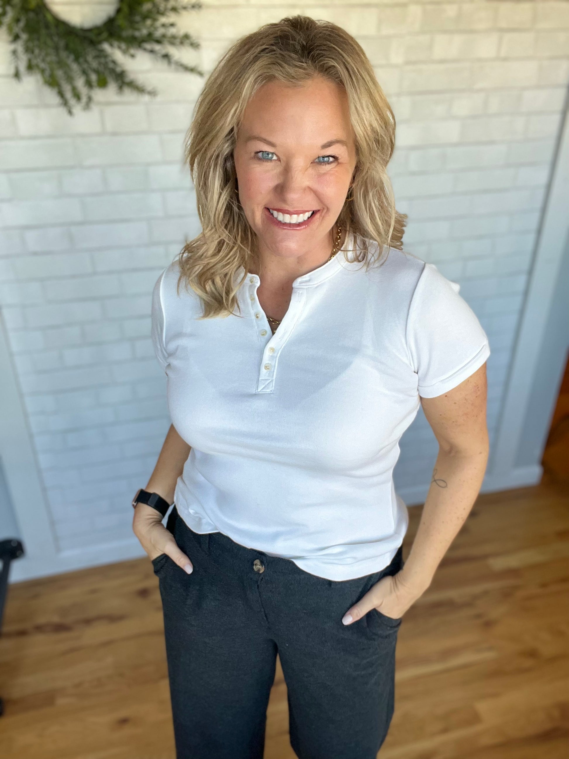 This is a cute fitted tee. It features 2 functional buttons (the rest are for show); there is also a stitched down cuff on the sleeve. These are fitted - size up if you want.