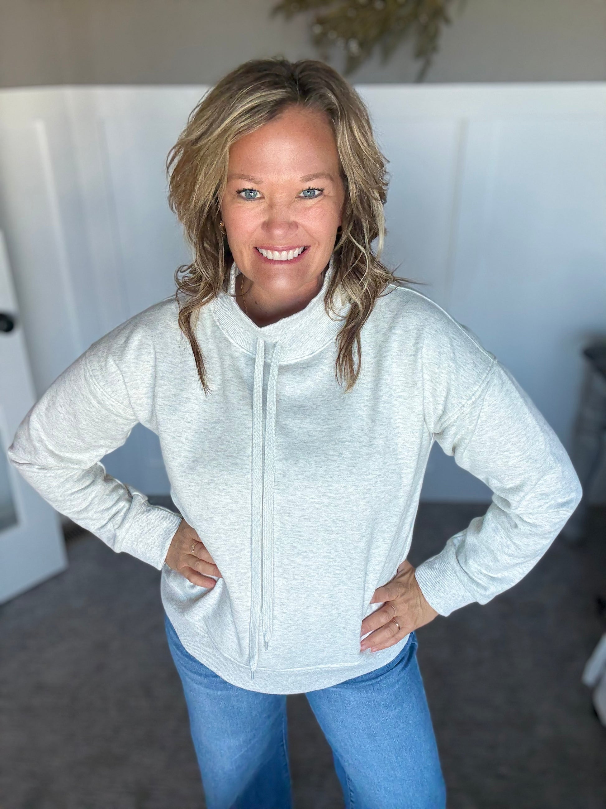 A grey sweatshirt with fun ties around the top. This one has a band along the collar, cuff, and hem. A drop shoulder and a soft material inside. Fit is true to size.