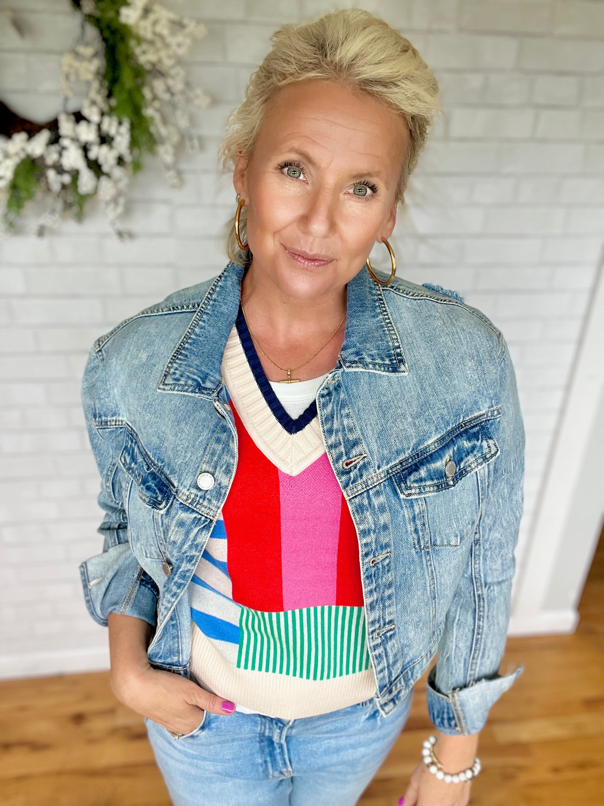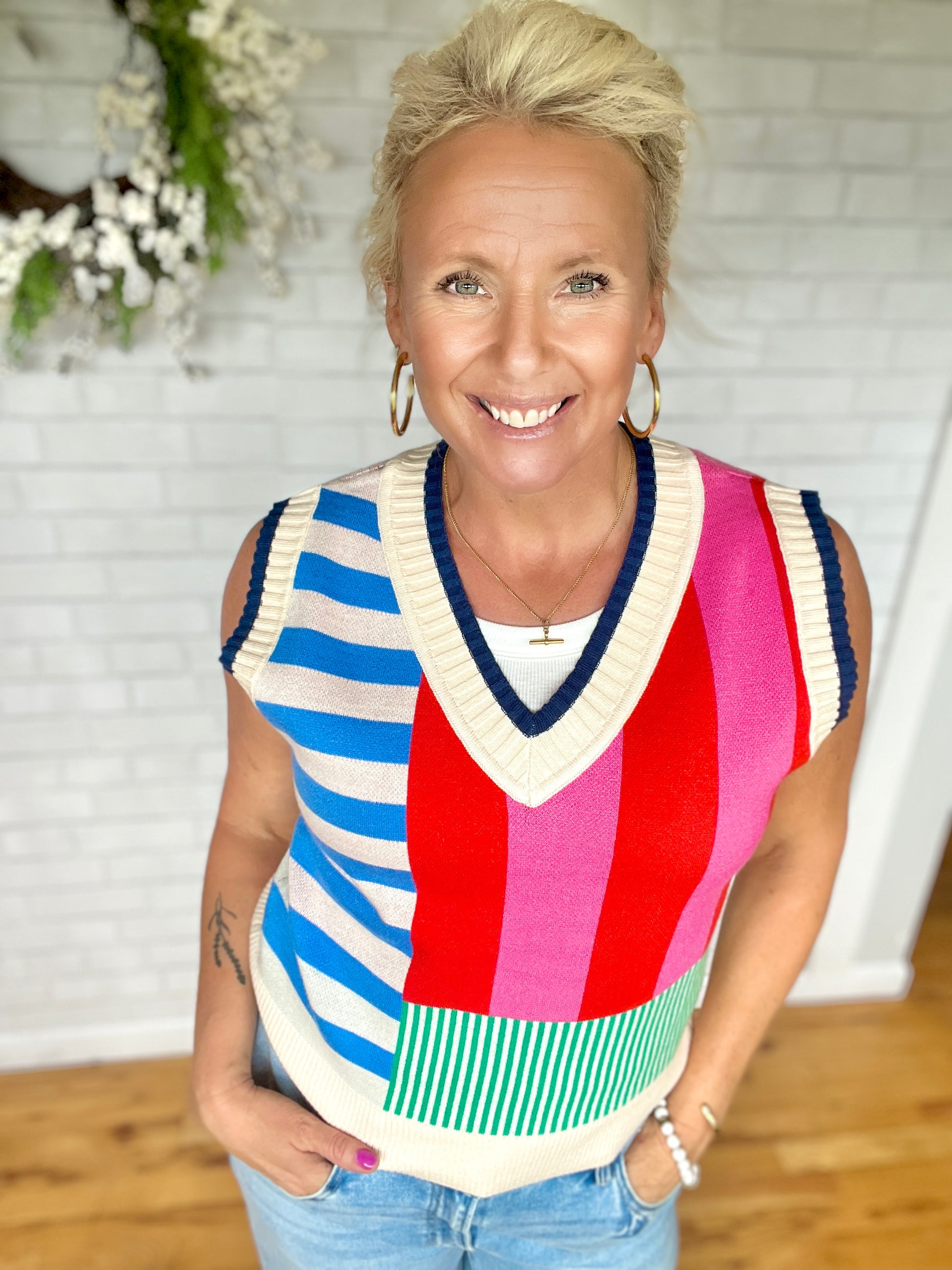 A striped knit top with a variety of different colors throughout! A sleeveless top with a v neck feature on the front. Fit is true to size.