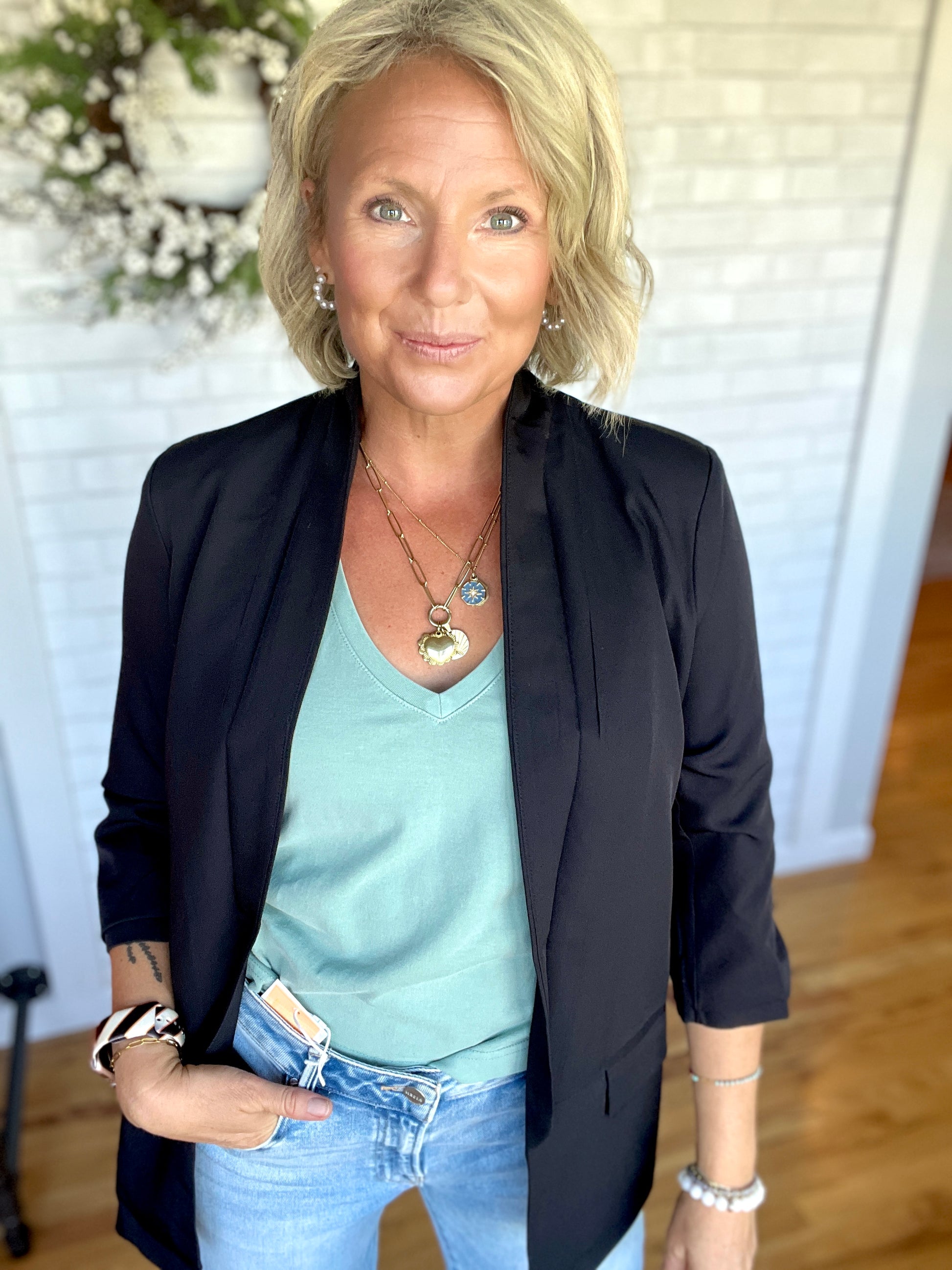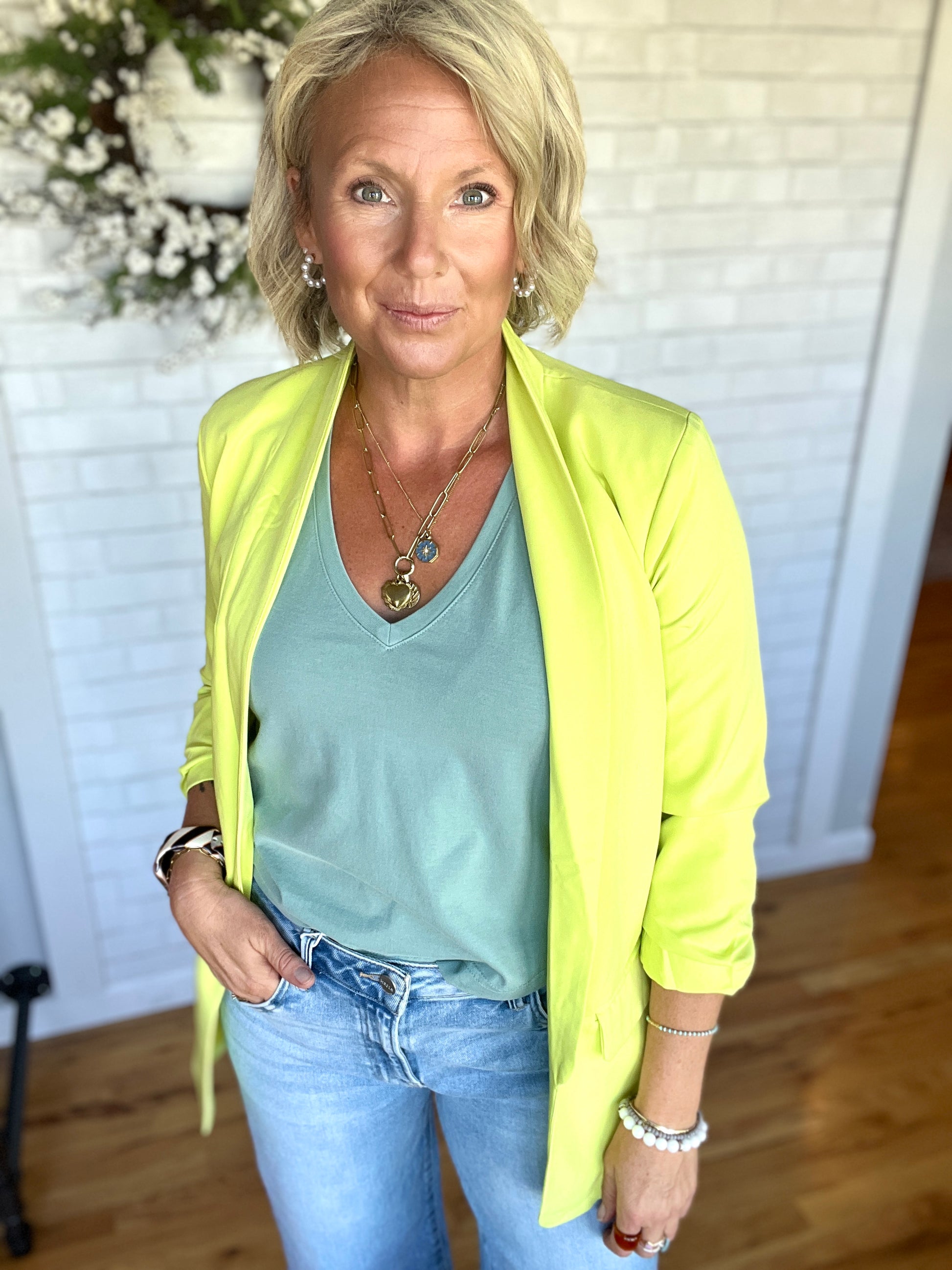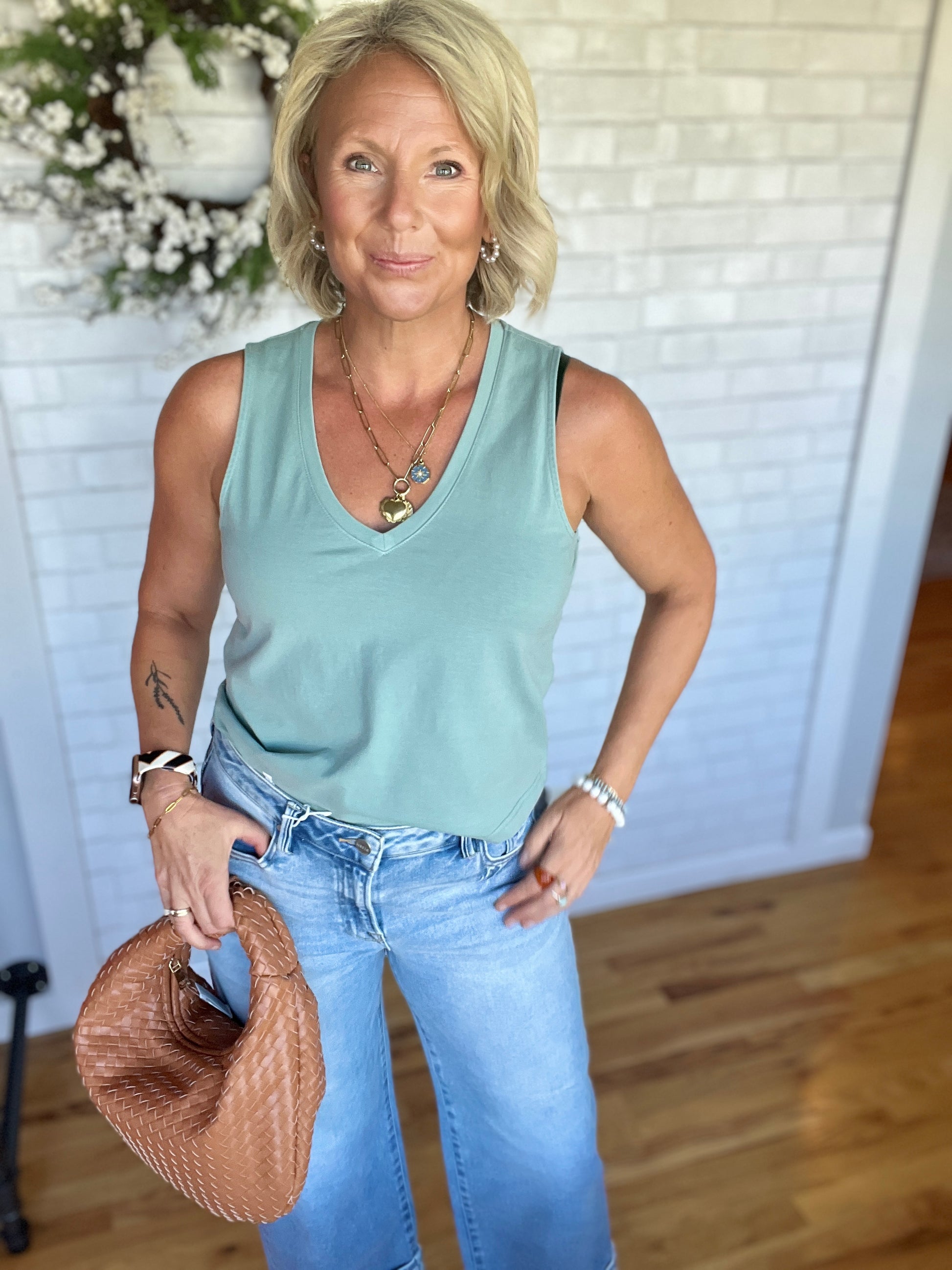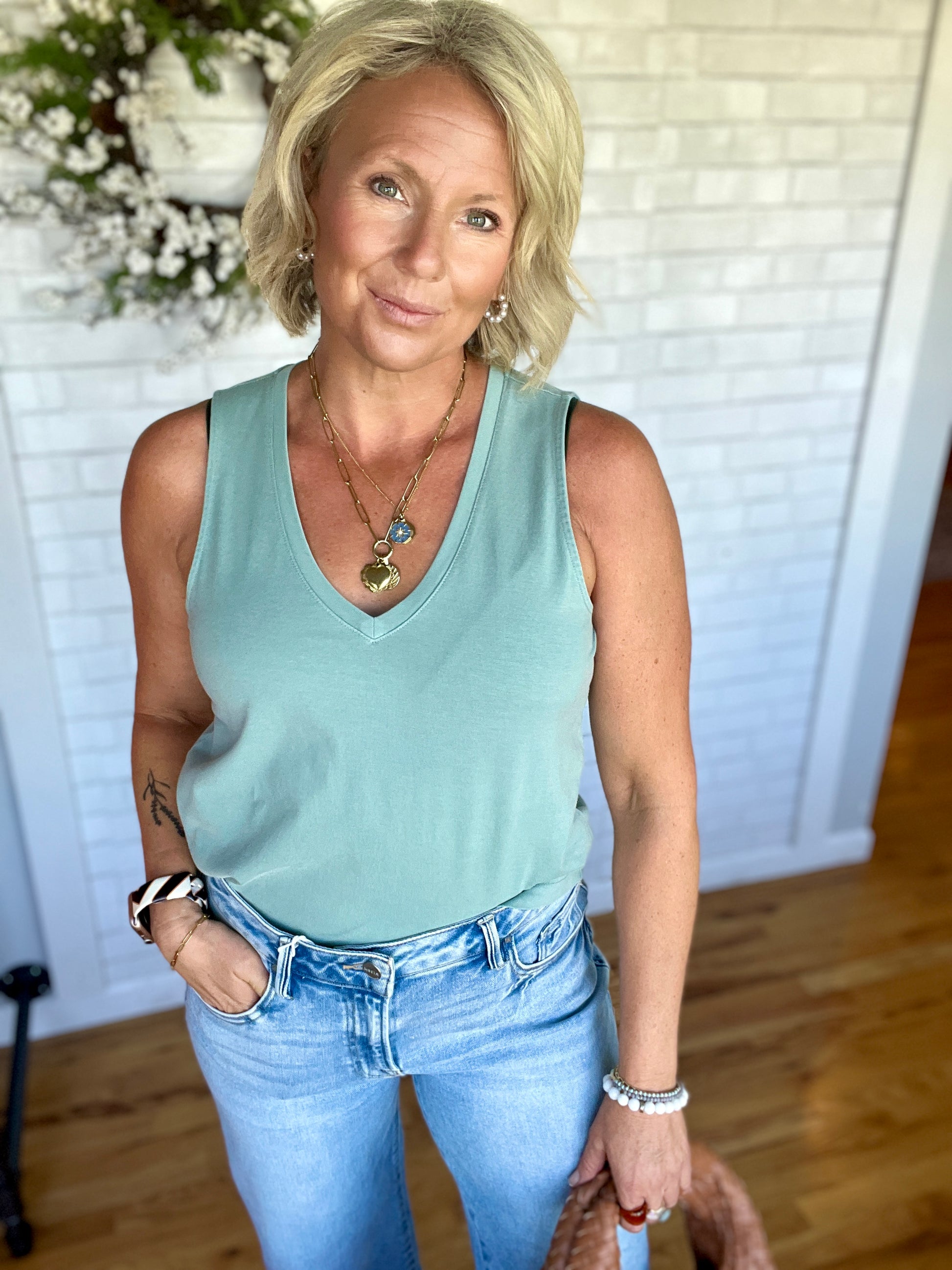 A cotton tank with a v-neck tank. This one has a slight washed look on the fabric. This one hits a little shorter. Fit is true to size. If you want more length size up one.
