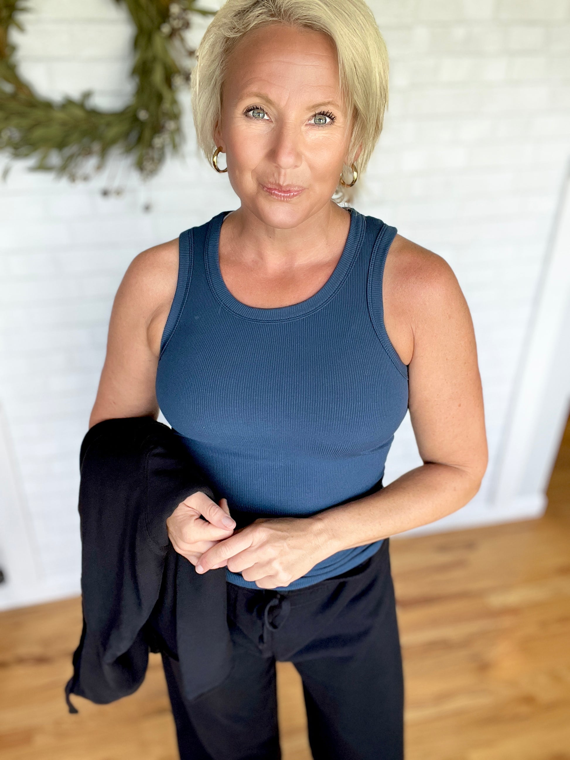 Everybody loves a versatile tank top. Crafted from a rayon-spandex blend fabric with micro ribbing, this tank top has a full-coverage racerback design, a rounded neckline, and a fitted silhouette.