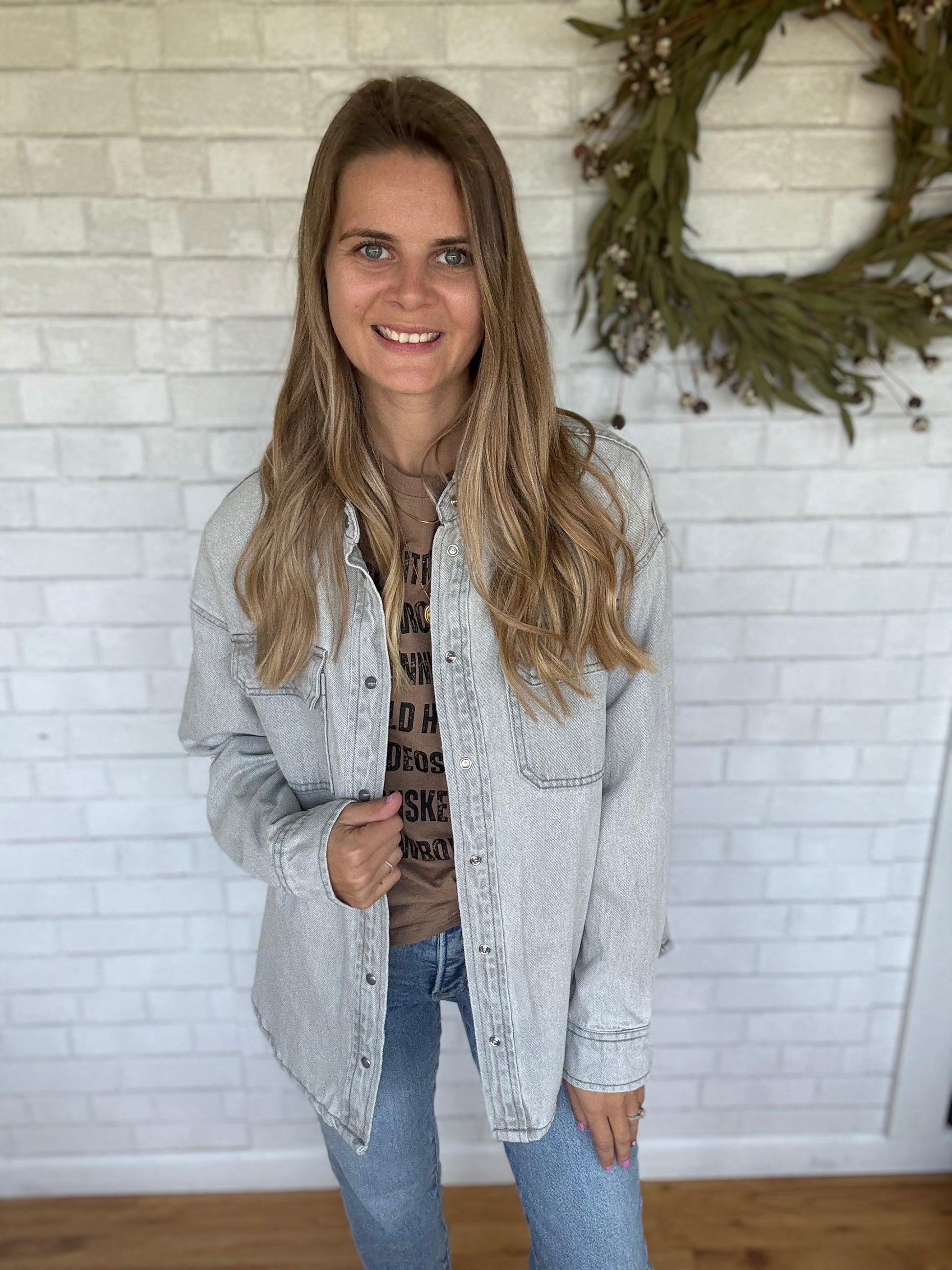 A button down jean jacket with buttons on the sleeves for closure. This one is a true to size fit.