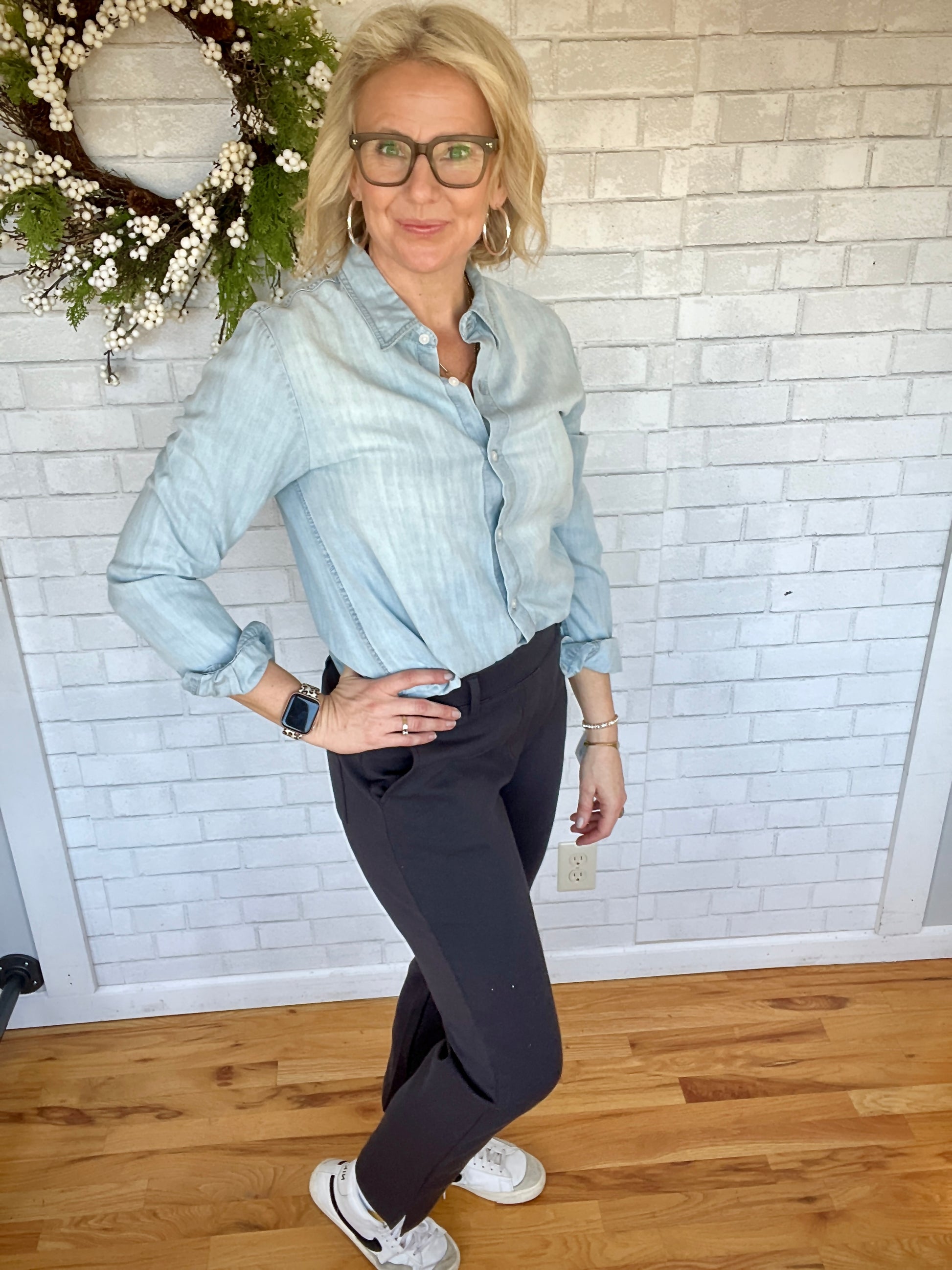 This pant is SO cute. It is a pull-on style made to look like a pant with a fly front. The pockets are real - 2 slant ones in front and 2 patch in back, Inseam is 27.5"; this pant has good stretch/give. Fit is true to size.