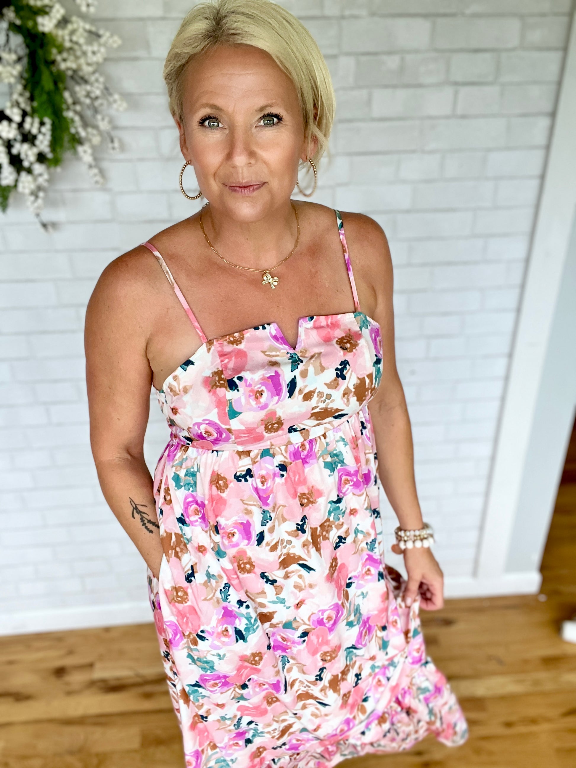 Pink and multicolored floral maxi dress. Adjustable straps and a tie on the back.