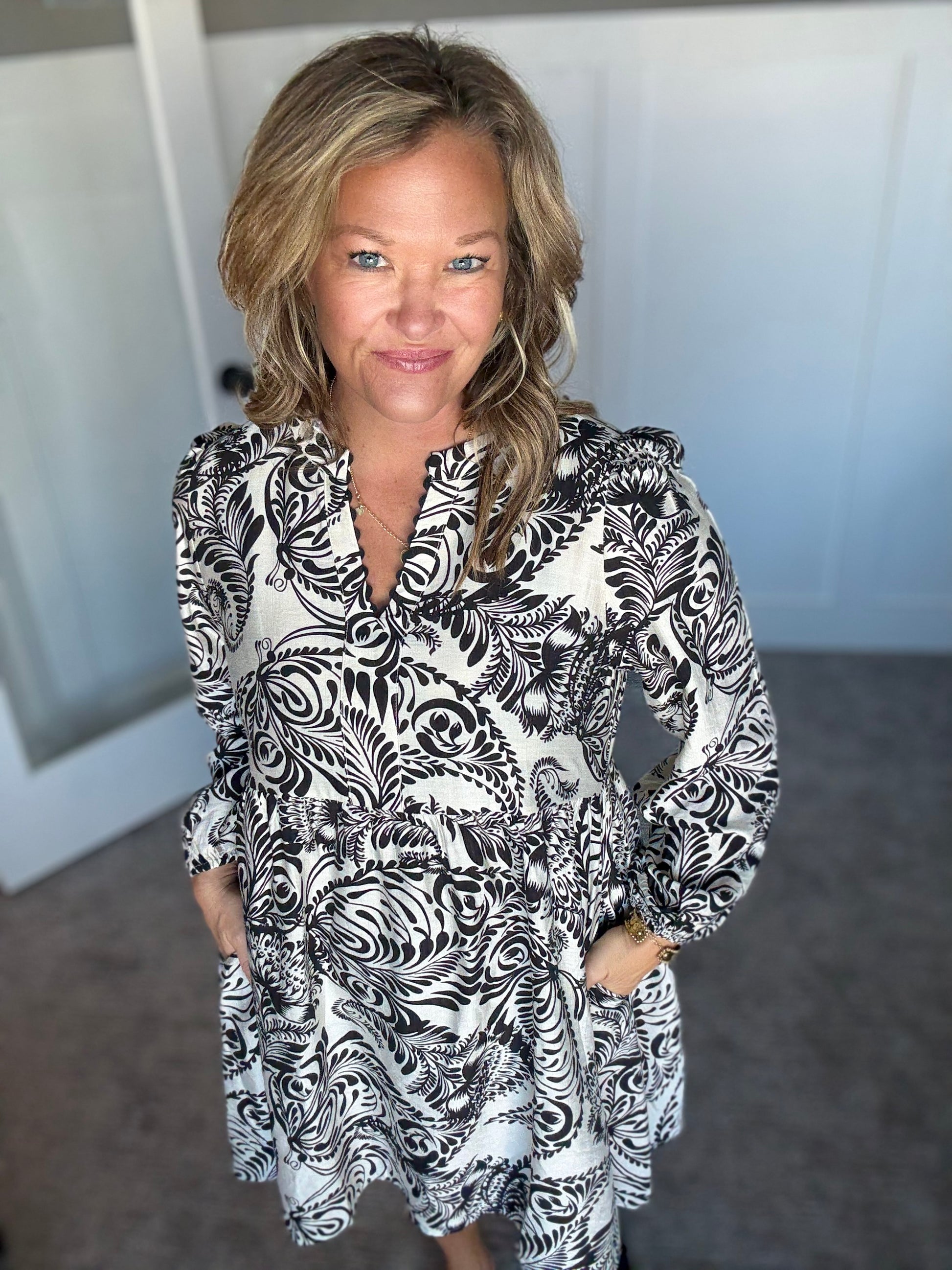 A fun floral dress with long sleeves and elastic around the sleeves. This one hits around the knee for length. This one is the perfect dress to transition into fall. Fit is true to size.