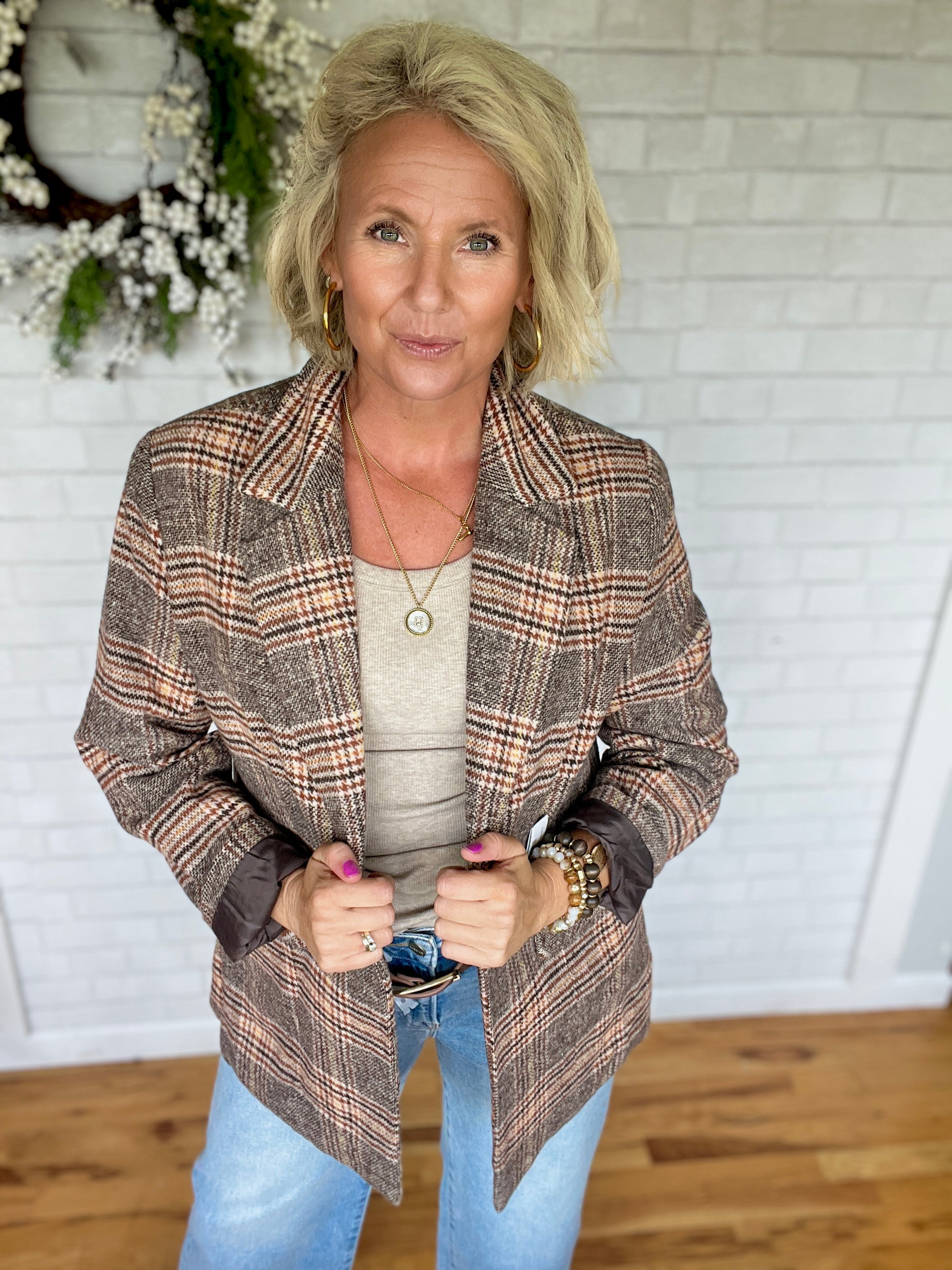 The Isabella is a classic piece for fall. A gorgeous brown plaid it is perfect for pairing with your cozy sweaters and long sleeved tops. Elevate your jacket weather looks with the Isabella Jacket. Fit is true to size.