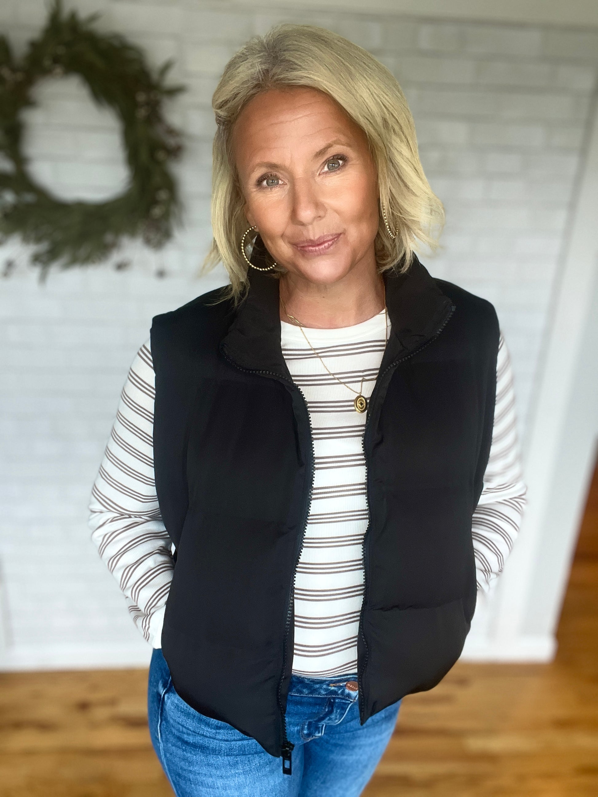 A puffer vest with side pockets and a zipper down the front. This is a great item to layer. Fit is true to size.