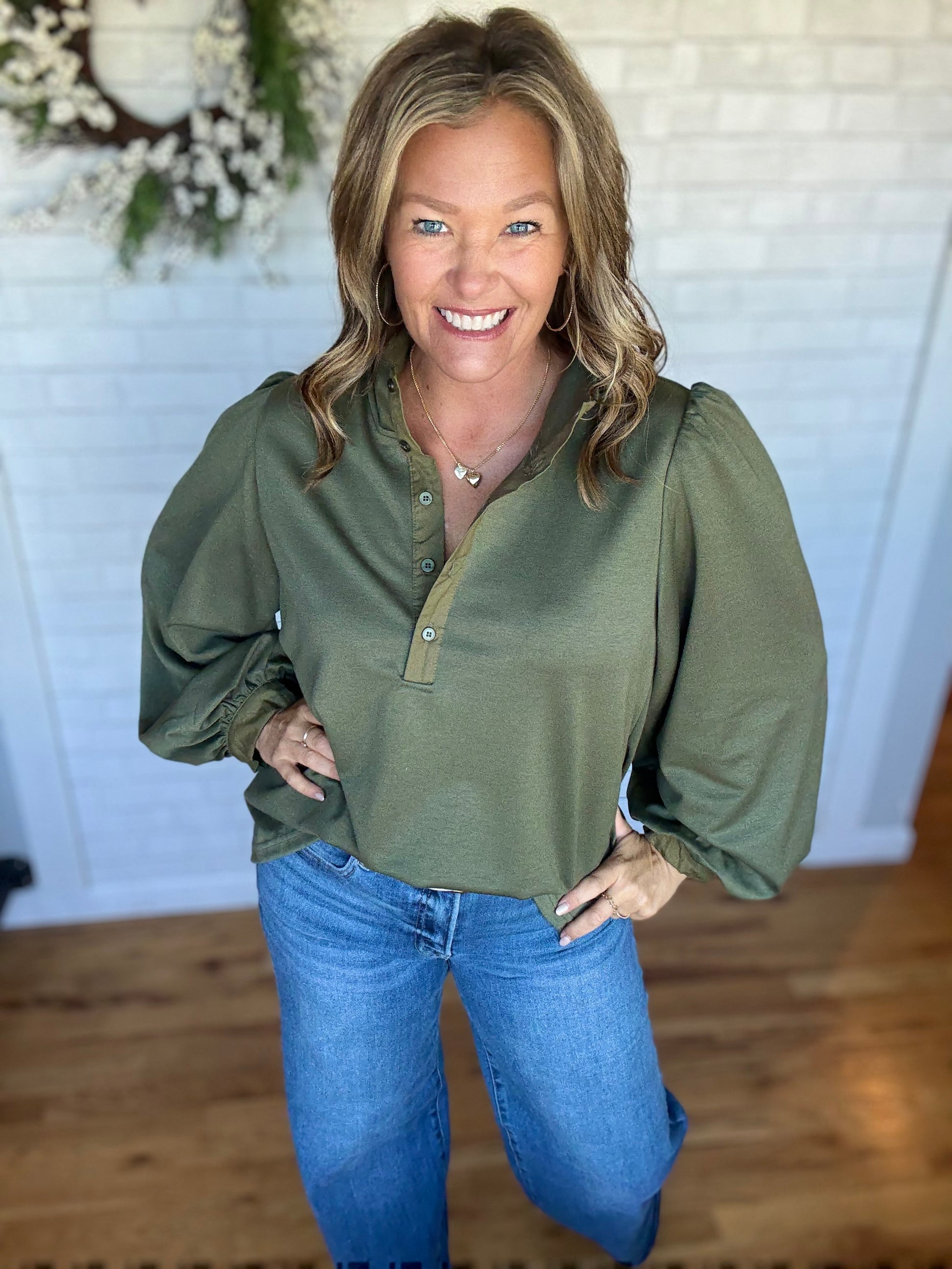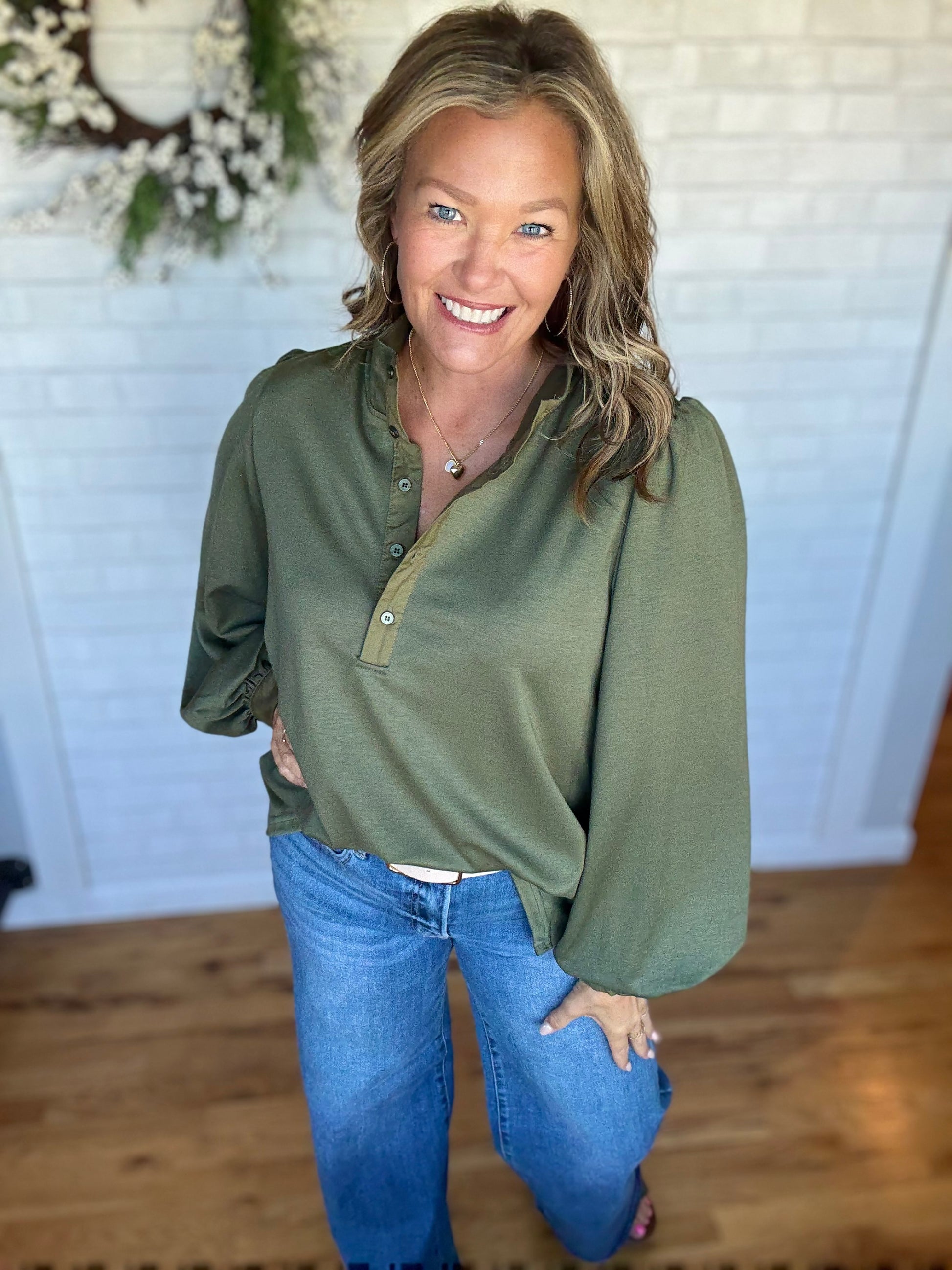 An olive top with buttons down the front. This one has a bubble sleeve that goes 3/4 of the way down. A fun top to dress up or dress down. Fit is true to size.