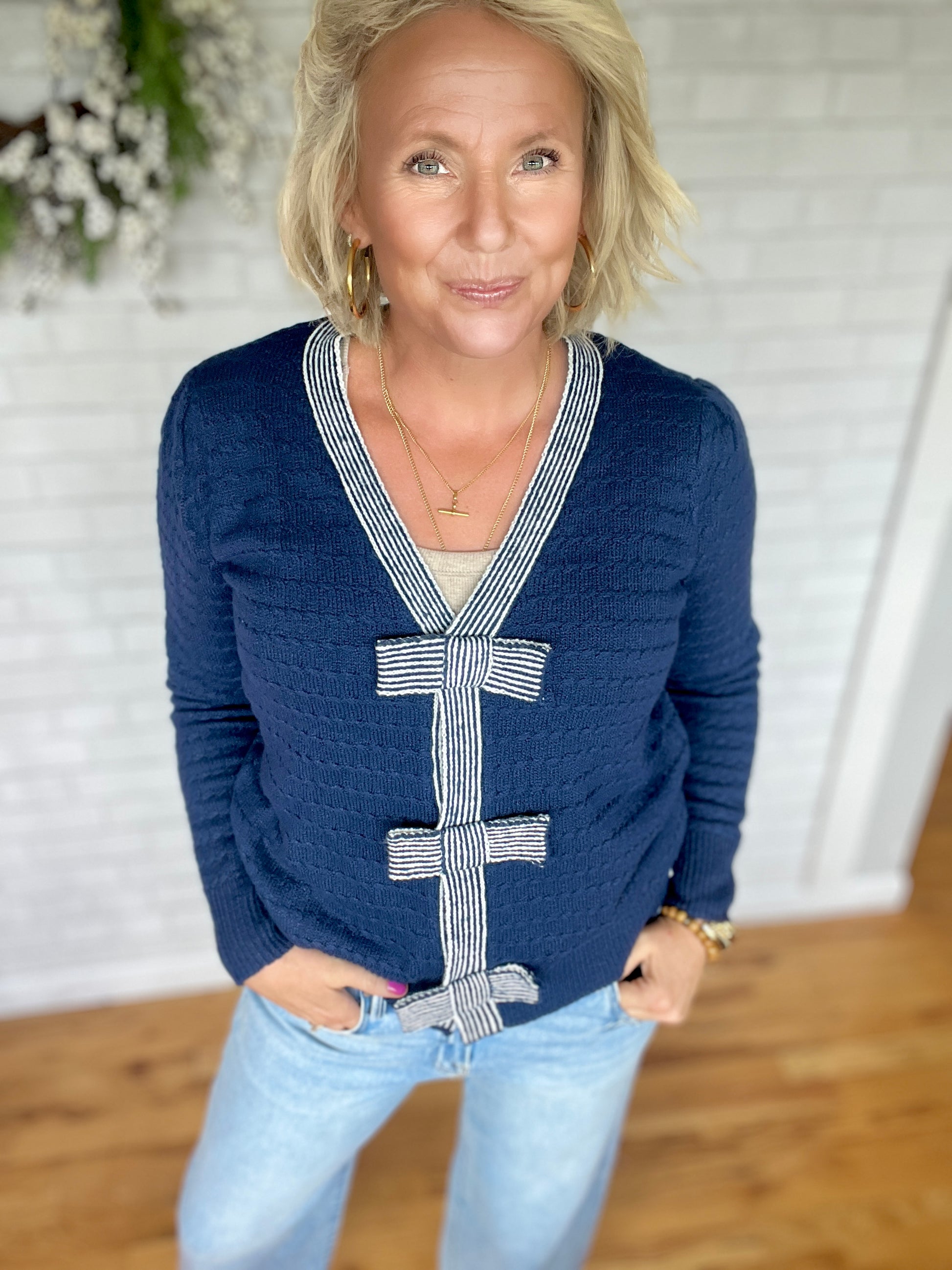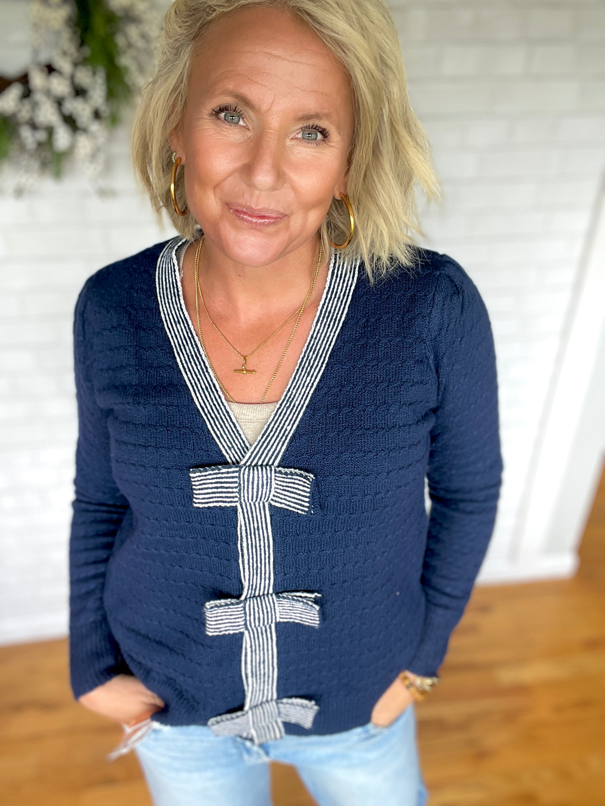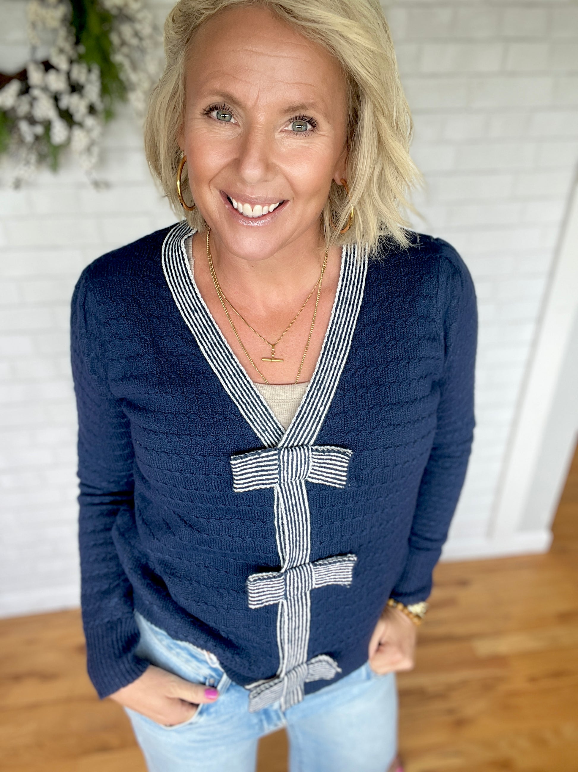 A corded knit cardigan with darling bow details that add the perfect touch of femininity and interest to this classic. Navy and white with snap closures . Fit is true to size.