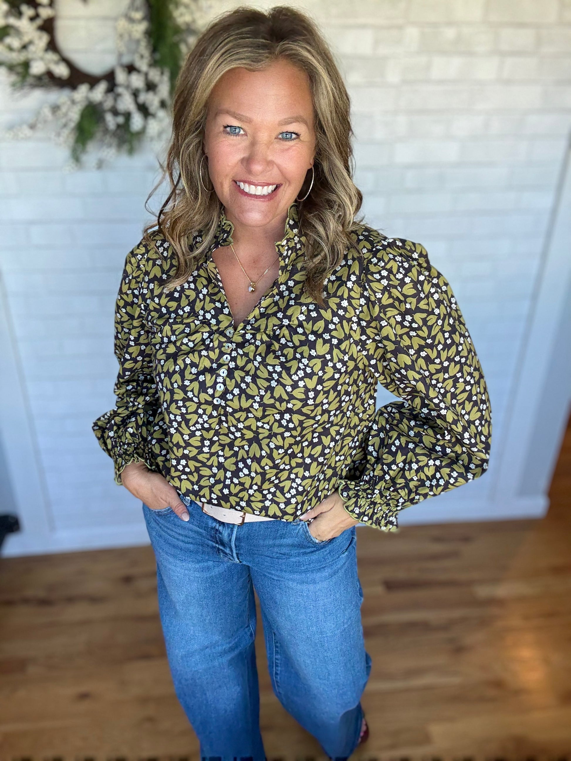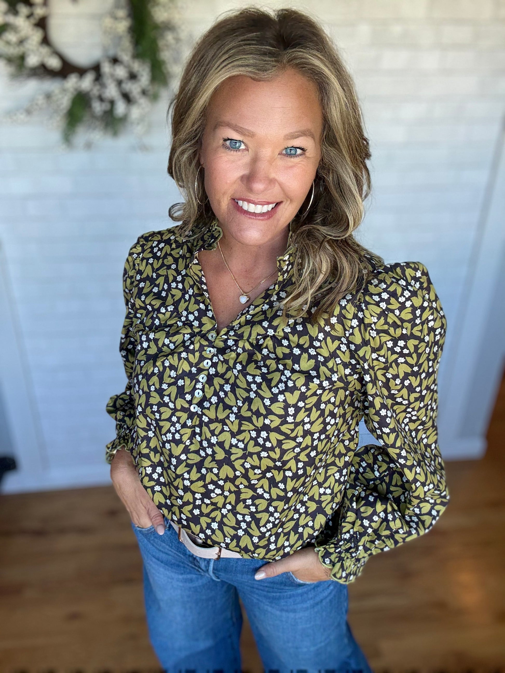 A charcoal and olive top with floral designs all throughout. This one has features of ruffles on the collar and cuffs, mandarin collar, and buttons on the front. Fit is true to size.