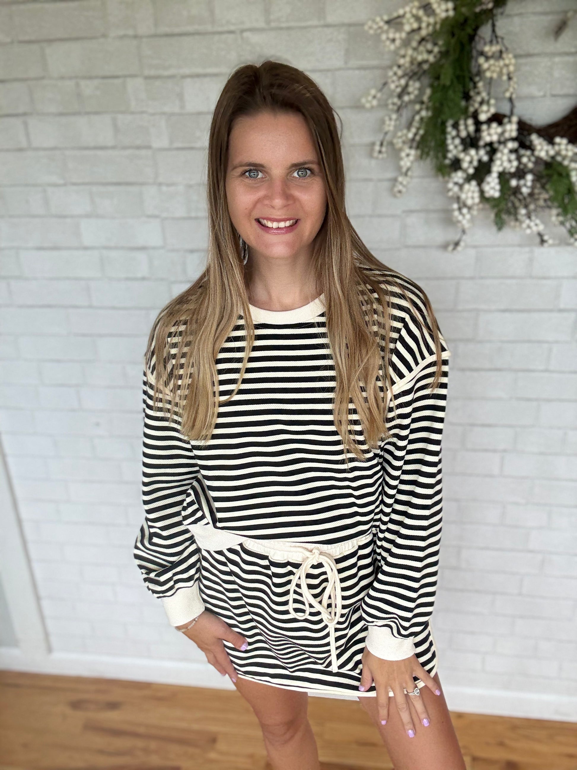 A black and off white striped skort. Drawstring and elastic around the waist. Fit is true to size.