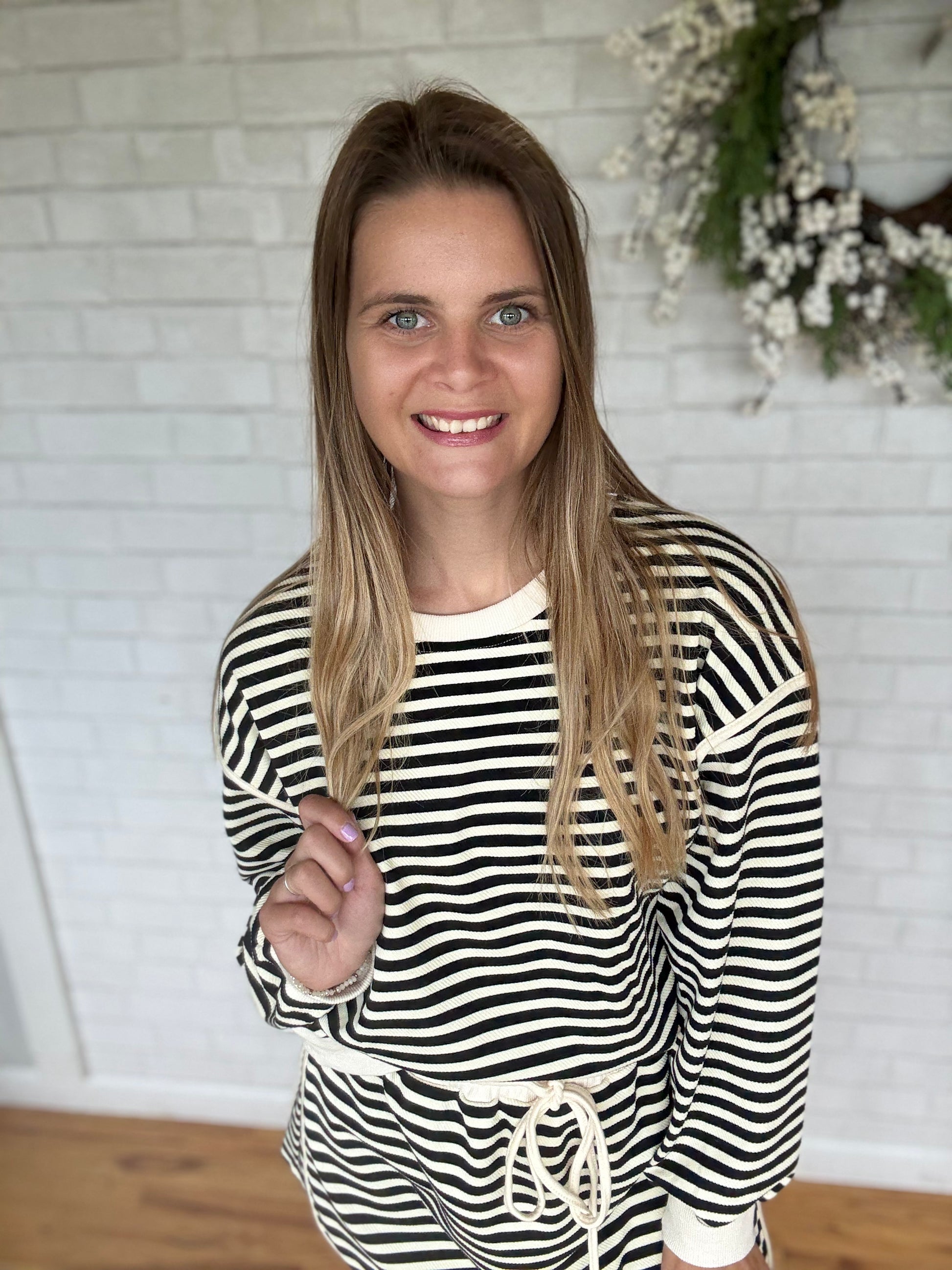 A black and off white striped top that is long sleeve. Ribbed detail around the collar, cuff, and hem. A cute rope detail on the shoulder. Fit is true to size.