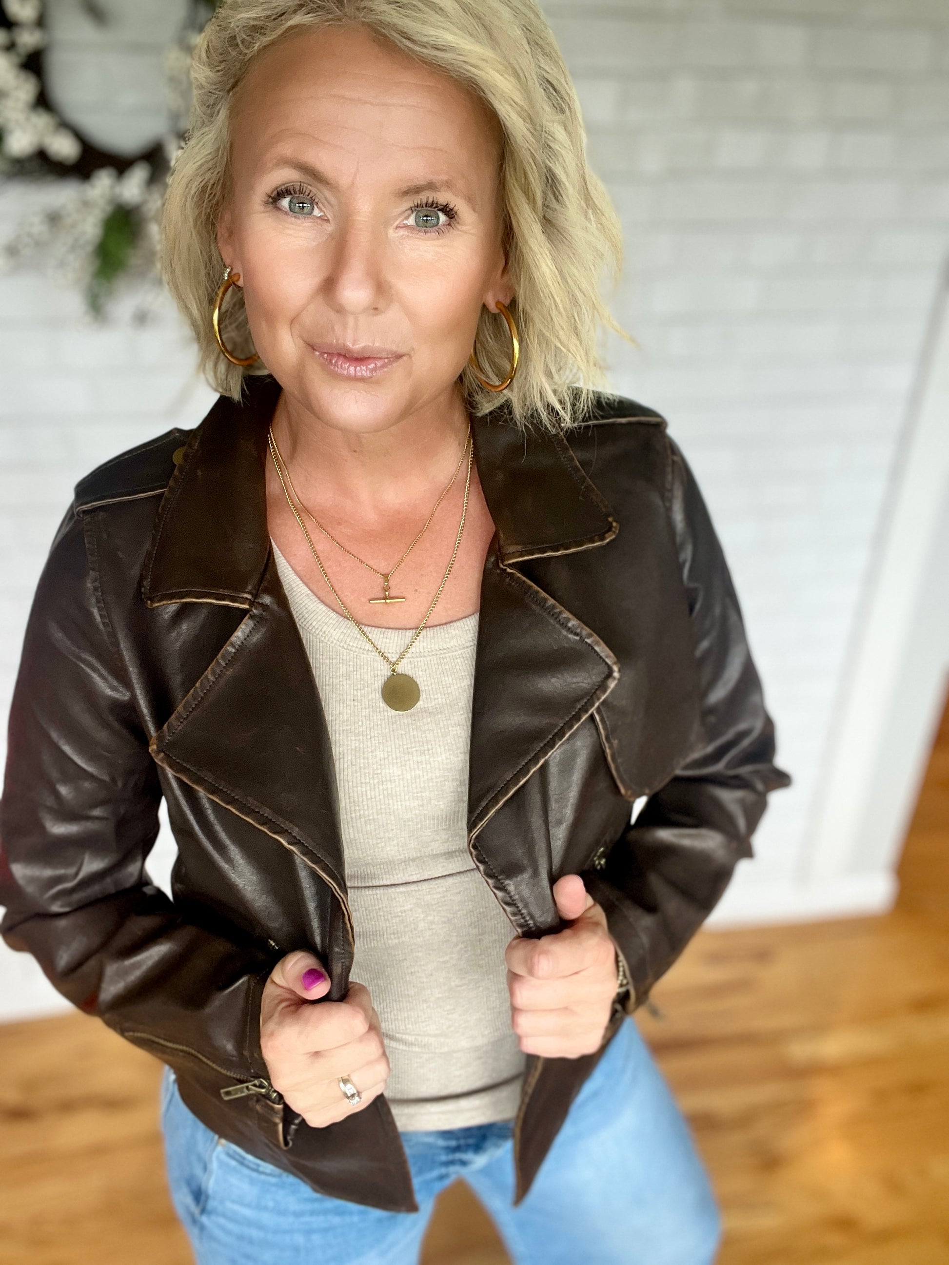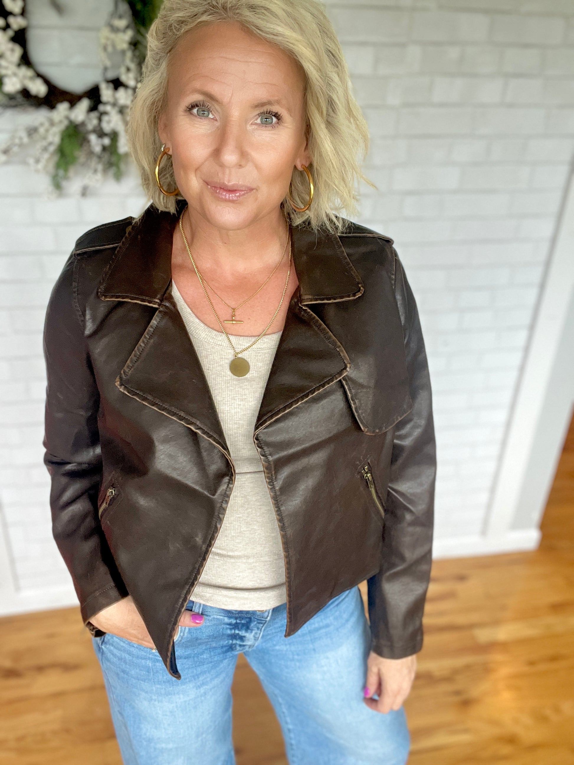 A coco brown leather moto jacket. Zippers on the side for pockets and zippers on the cuff as well. This one has a little bit of distressing throughout the jacket. Fit is true to size.