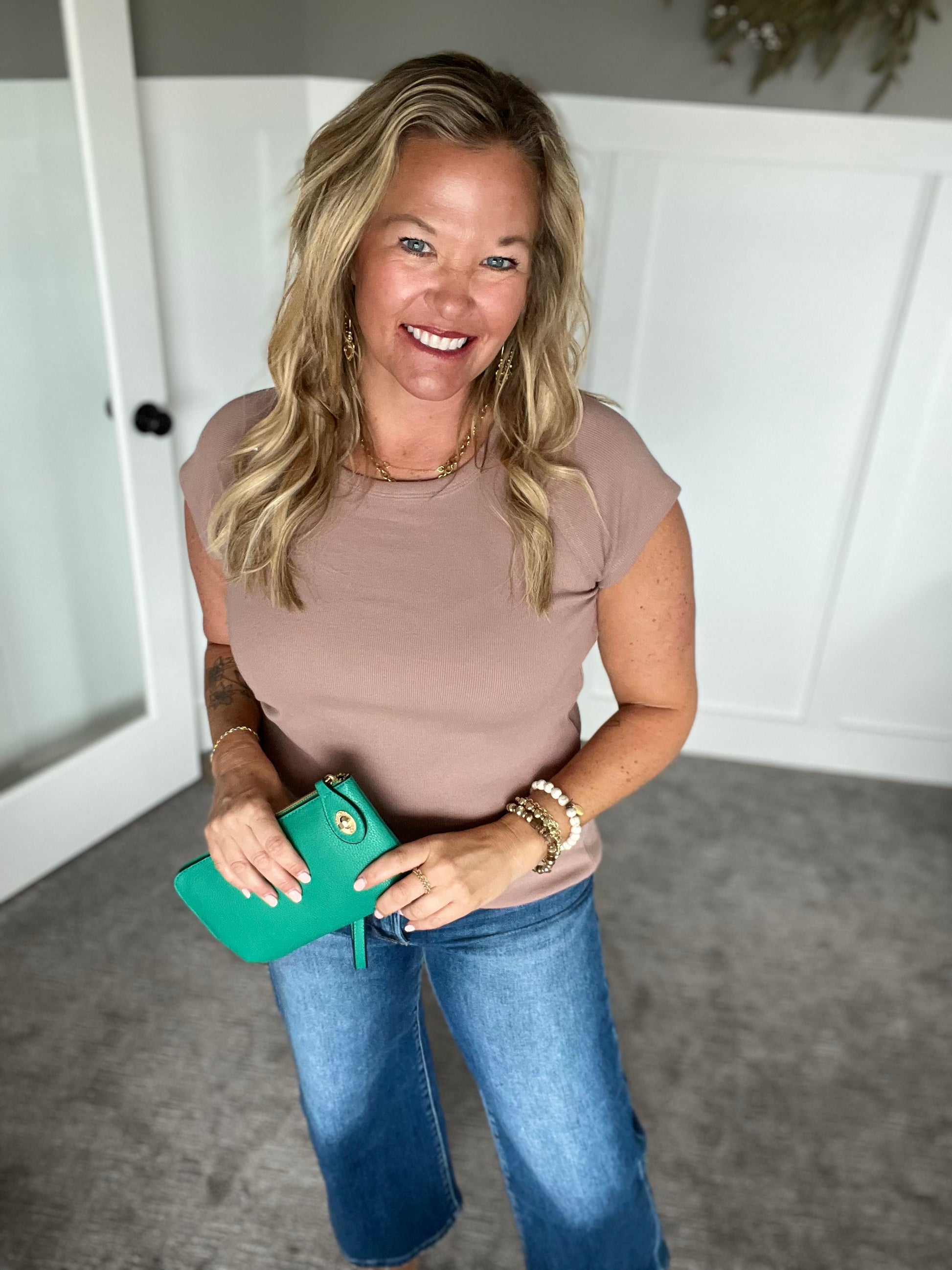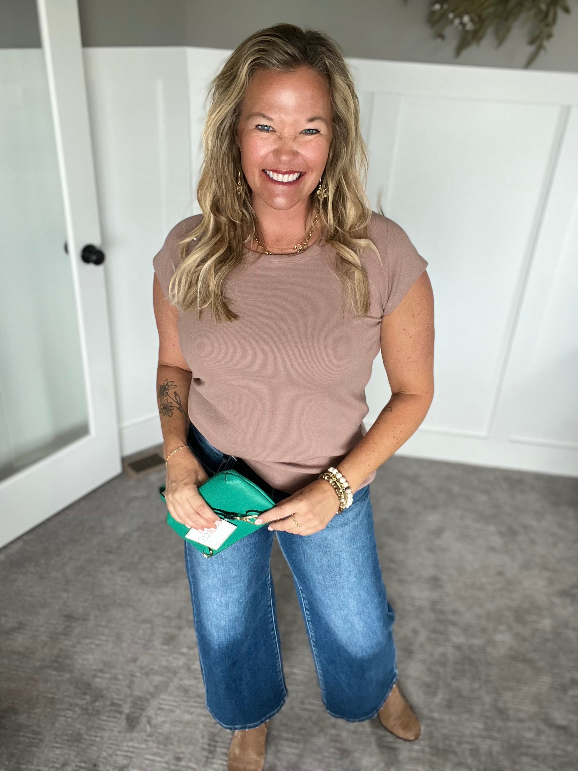 A ribbed top with a scoop neck. A raglan type sleeve with the stitching. Fit is true to size.