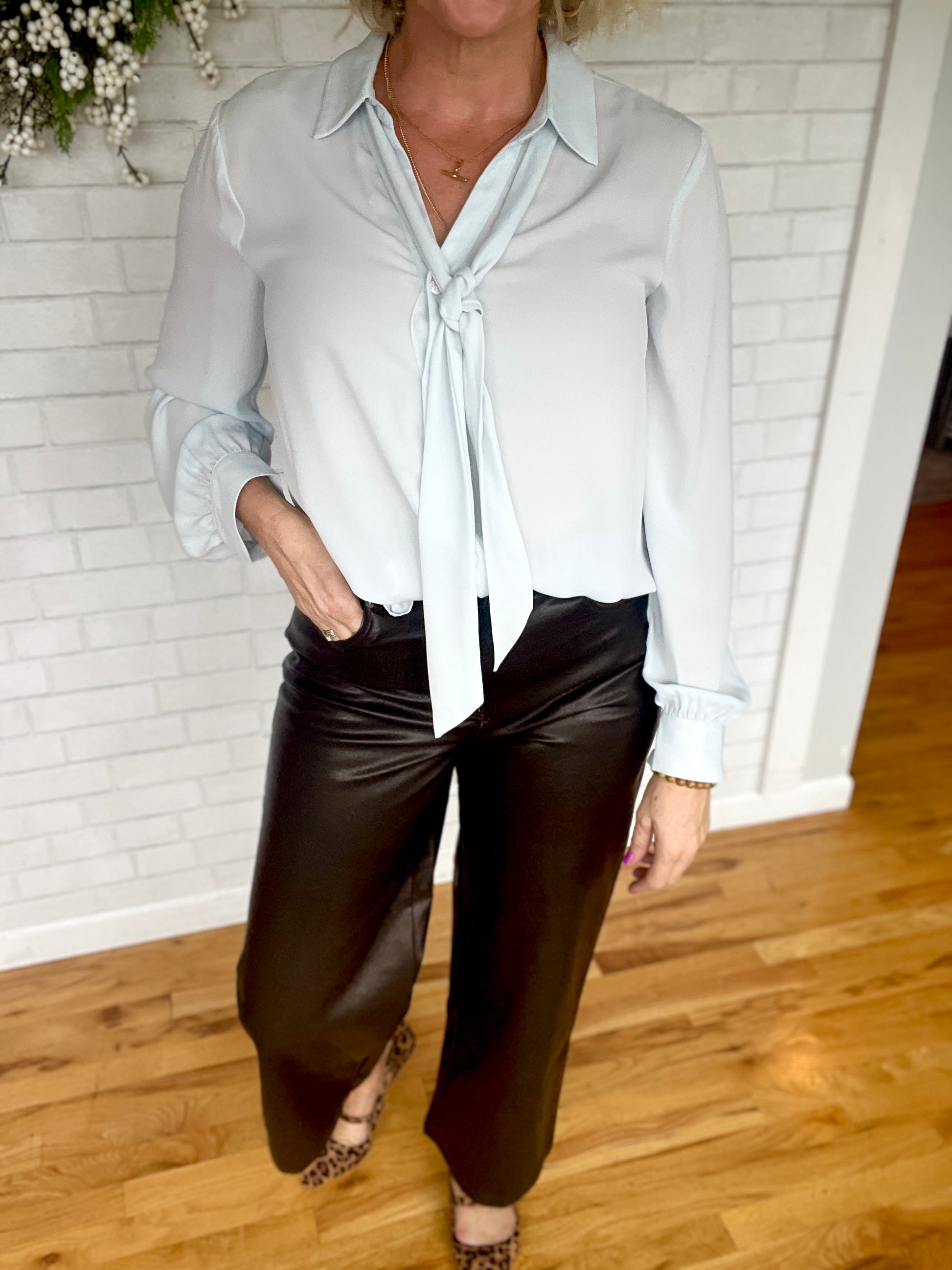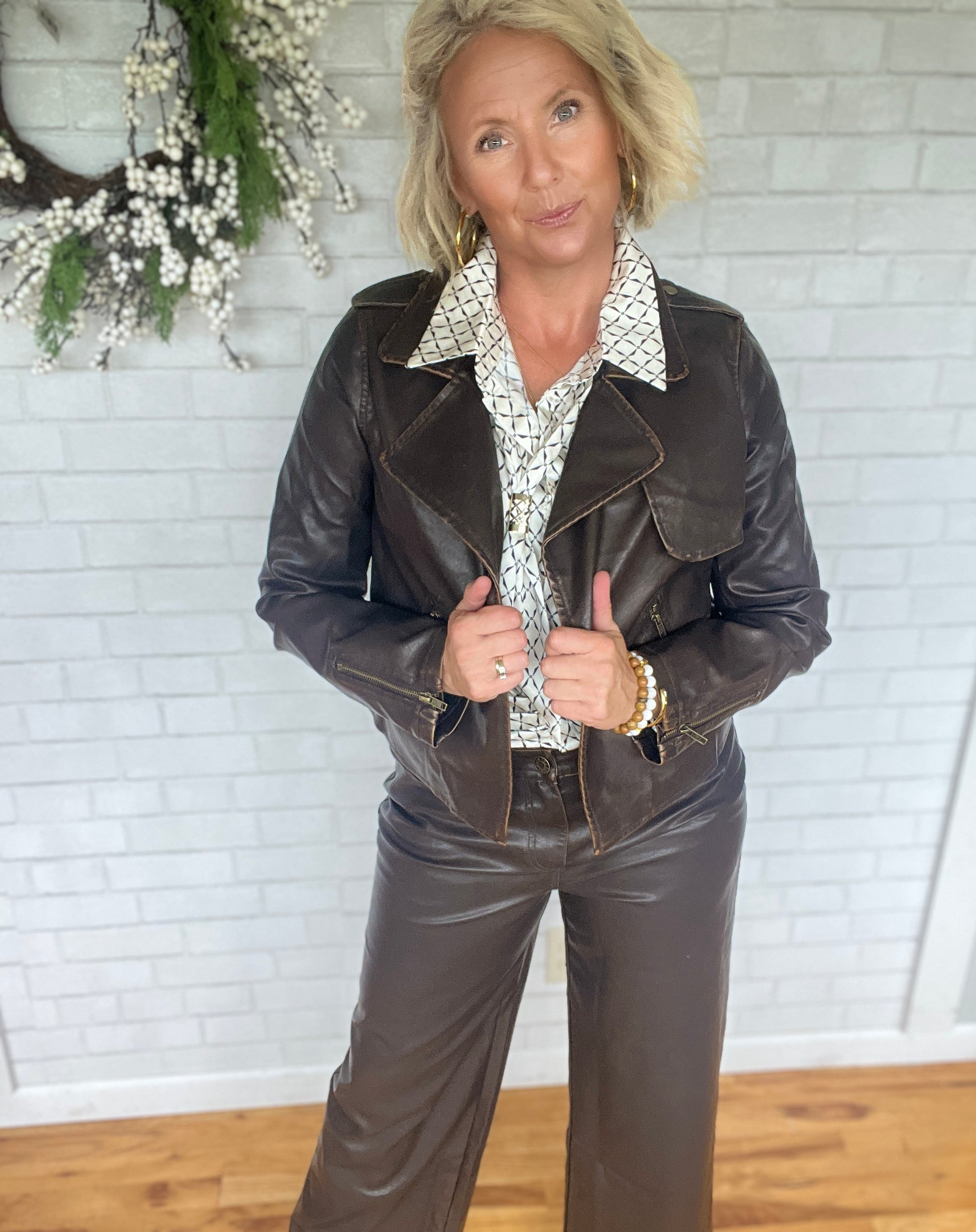 A faux leather pant with a button and a zipper closure in the front. The fit of these pants is more of a straight leg. Pockets in the front and the back. Fit is true to size.