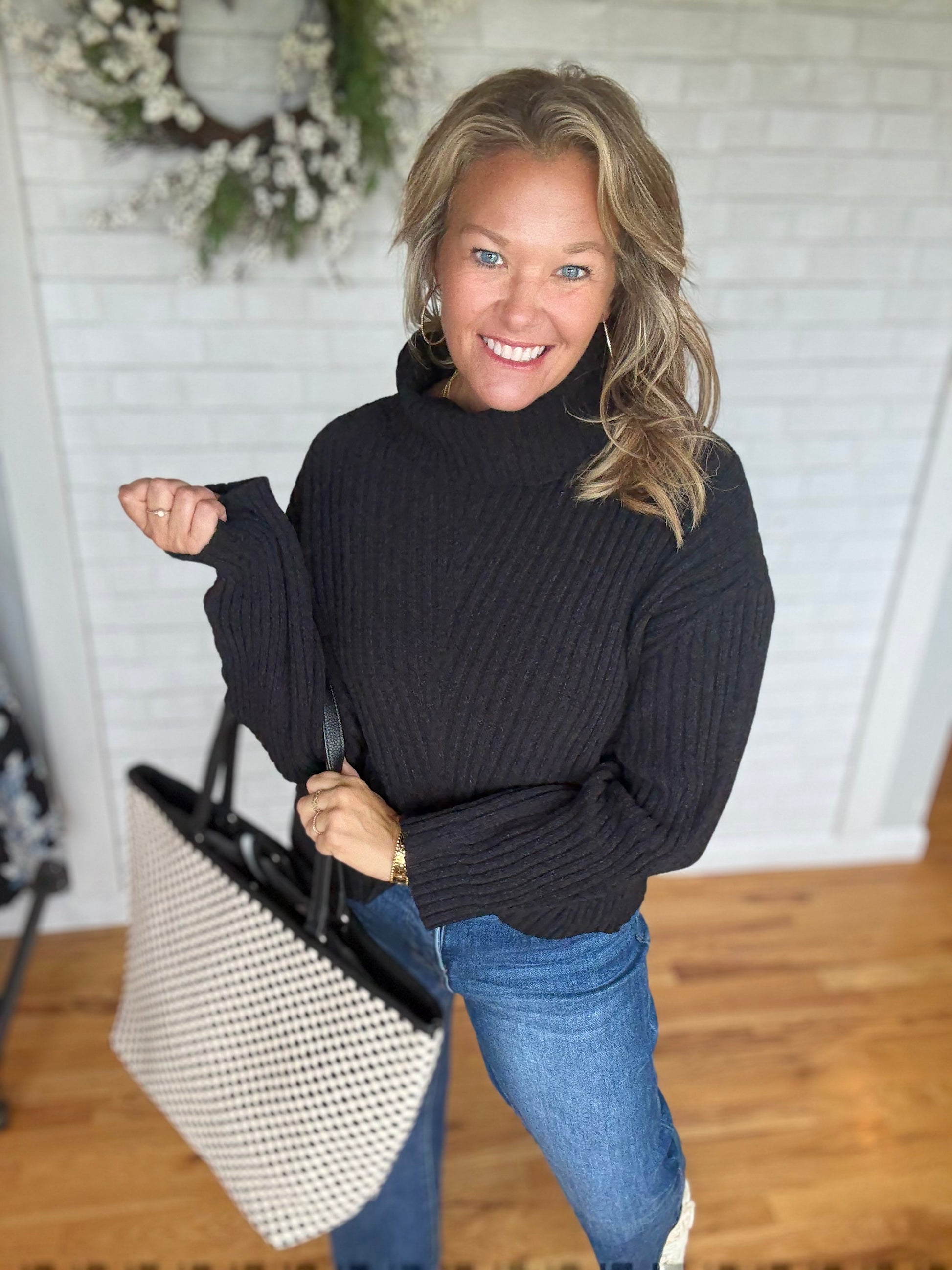 A knit sweater with a cowl/turtleneck. This one has a drop shoulder feature along with a body that meets you at your jeans. Fit it true to size.