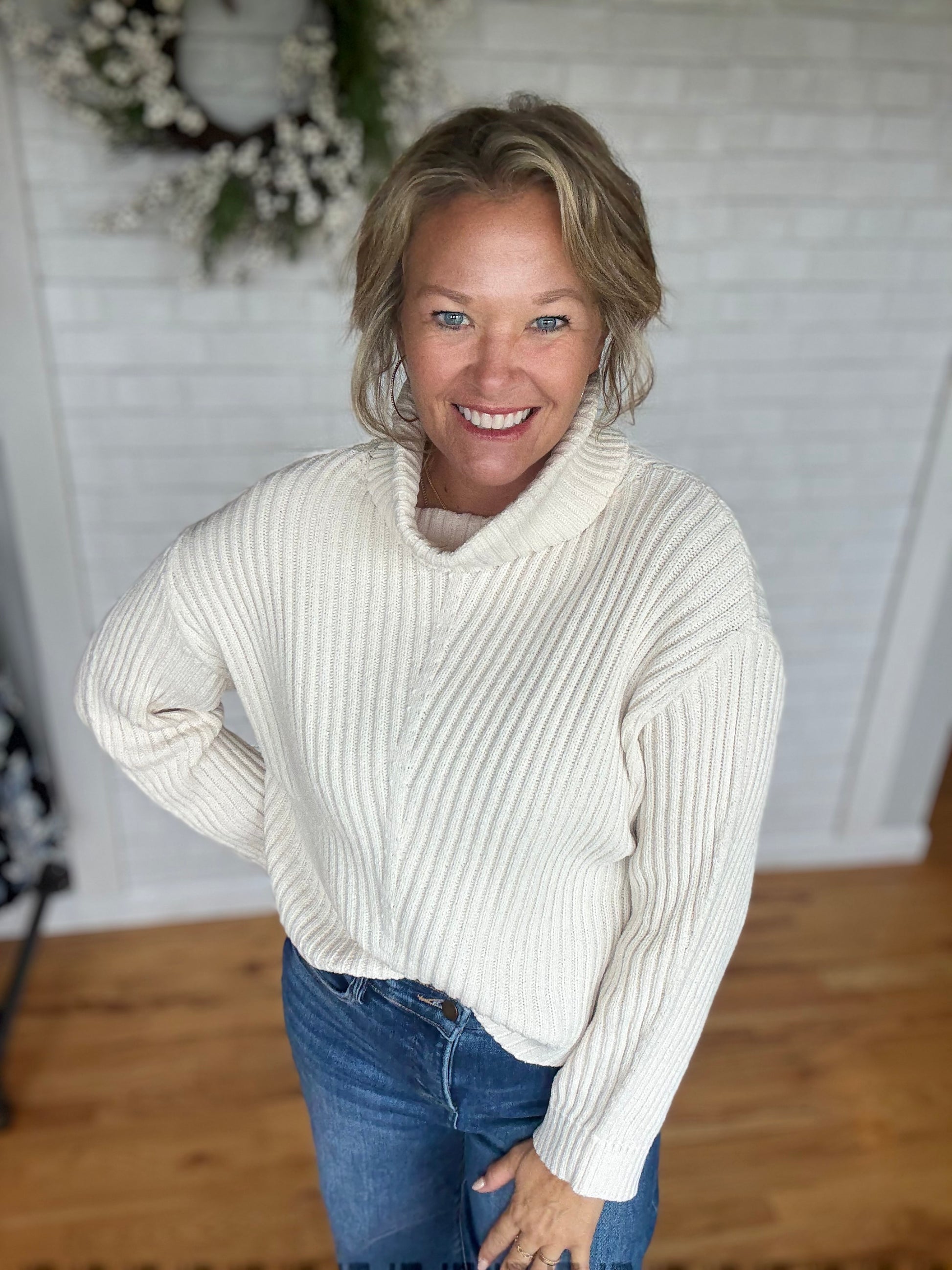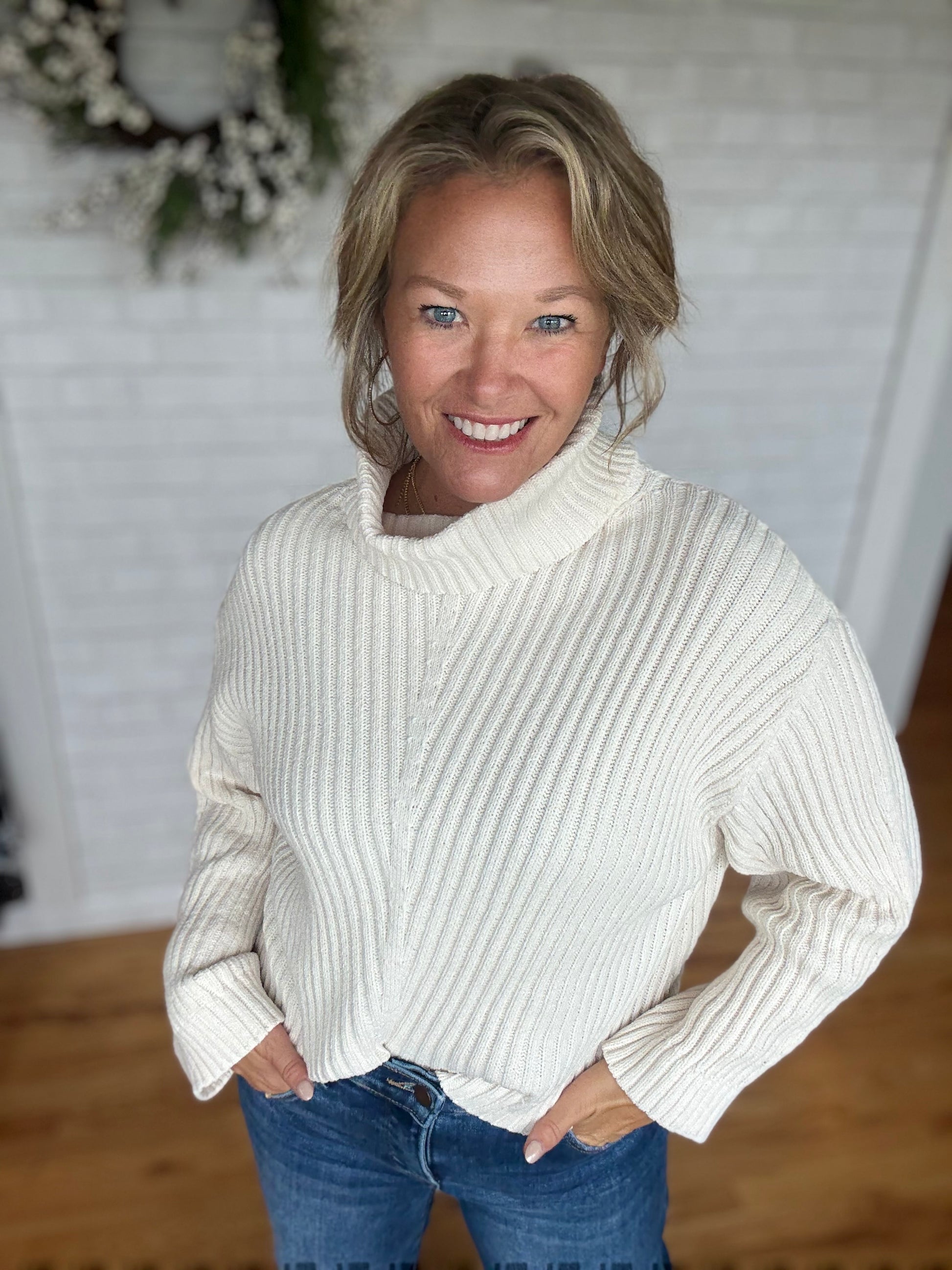A knit sweater with a cowl/turtleneck. This one has a drop shoulder feature along with a body that meets you at your jeans. Fit it true to size.