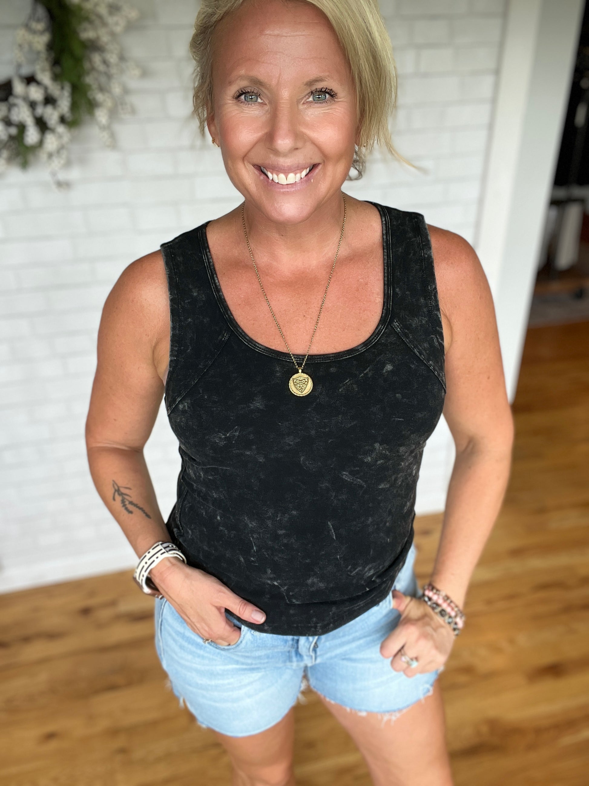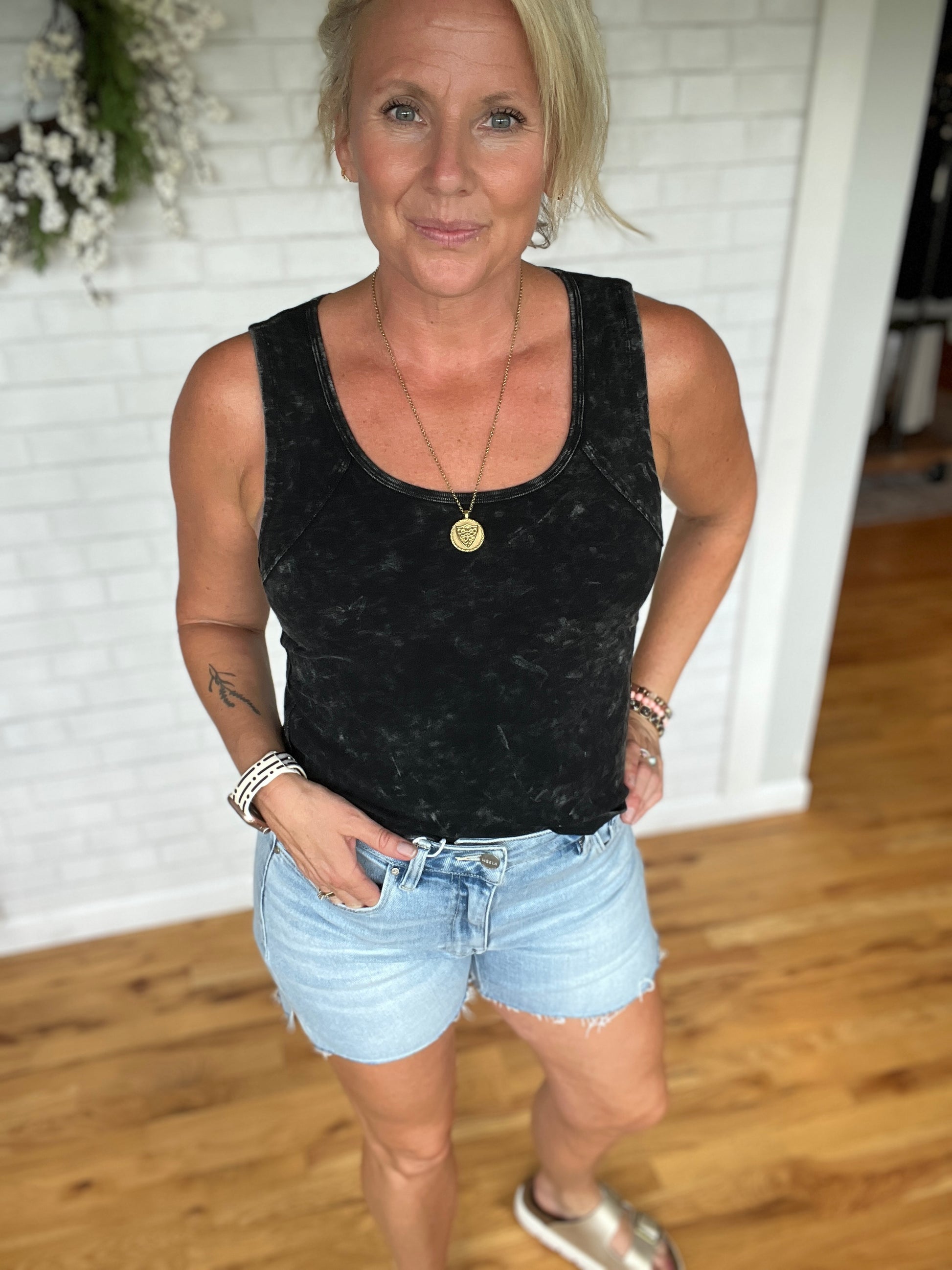 This tank has a lot of stretch to it as well as raw seam detail on the front bodice and neck. Fit is true to size.