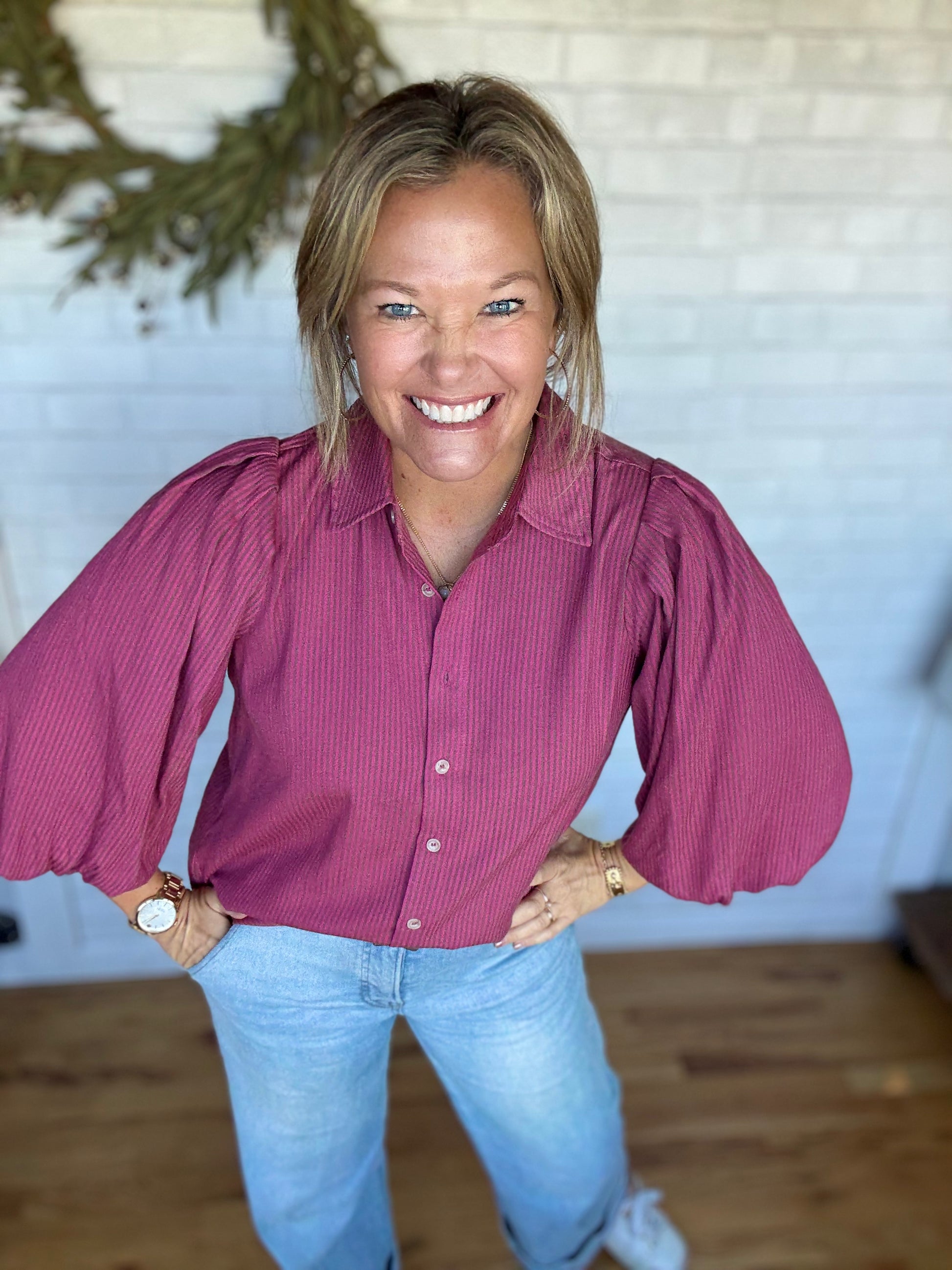 A dark pink color top with a light brown stripe throughout. This one has buttons down the front and a puff sleeve. Fit is true to size.