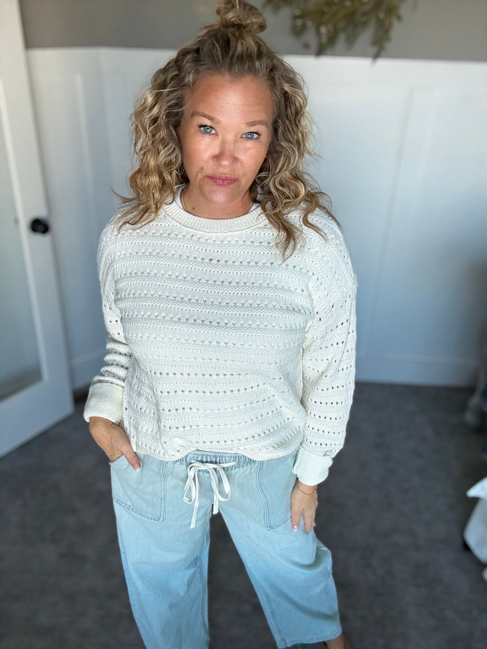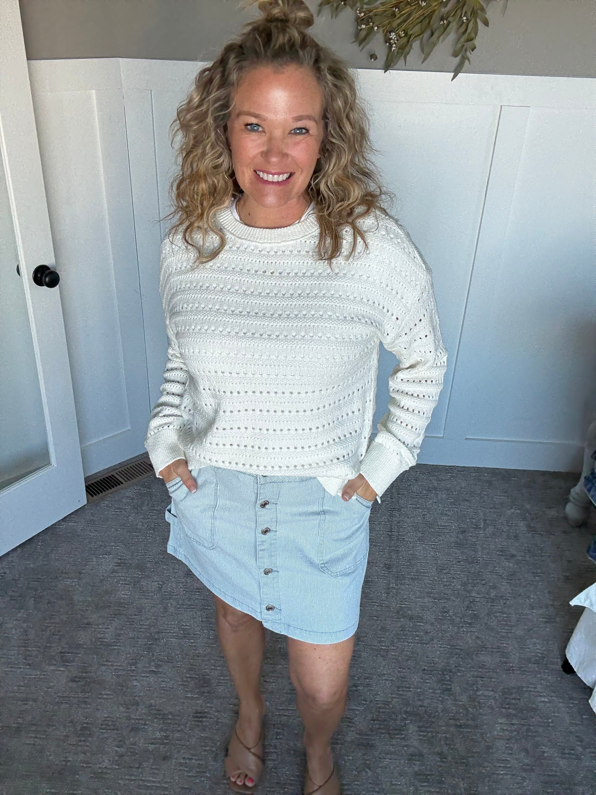 A solid color sweater with a larger knit detail throughout. You will want to wear a top underneath this top. A great one to wear all year long! Fit is true to size.
