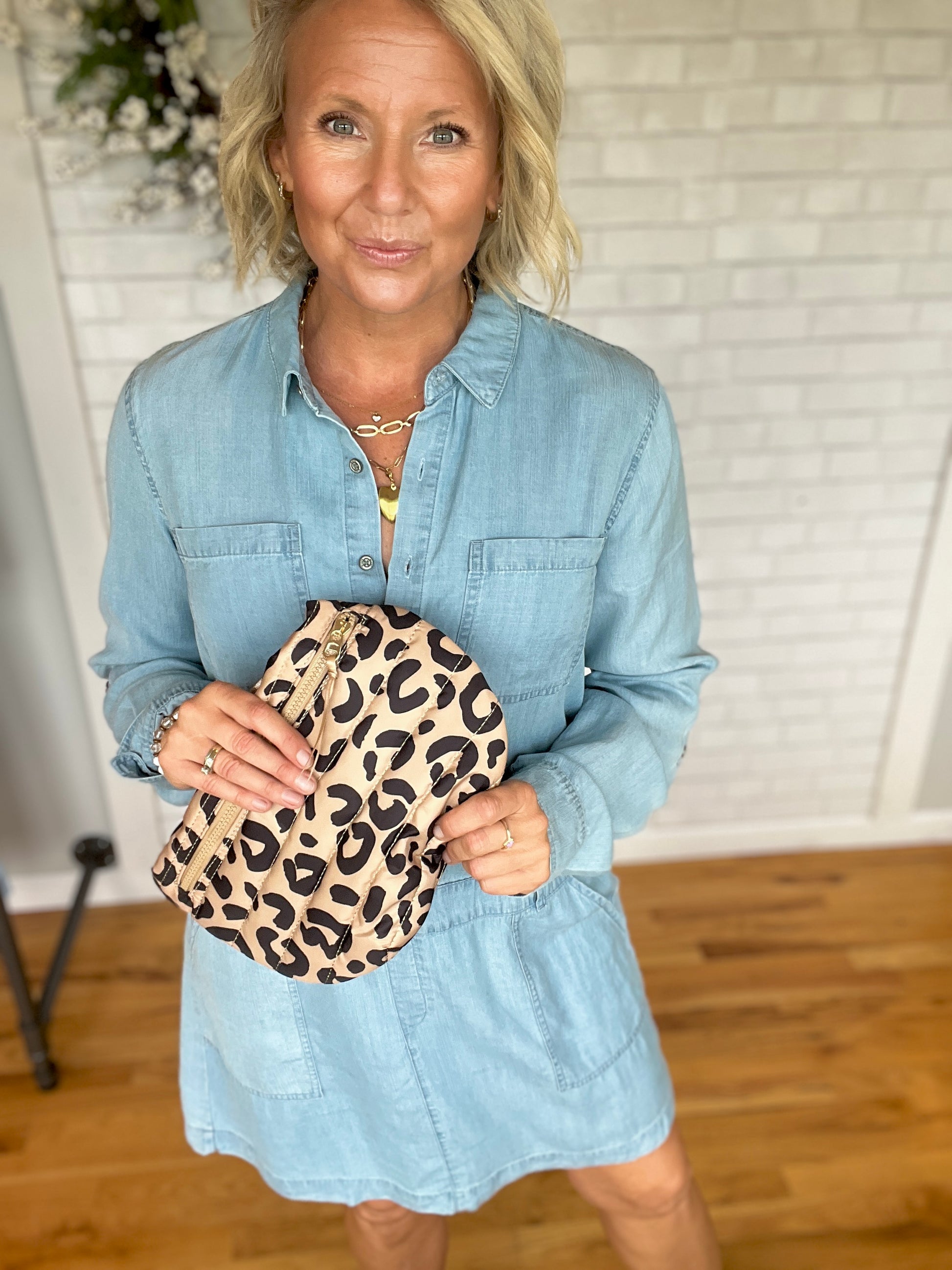 A light denim looking dress. A button up tencel dress with belt loop accents at the waist. Pockets on the chest and roll up sleeve details. Fit is true to size.