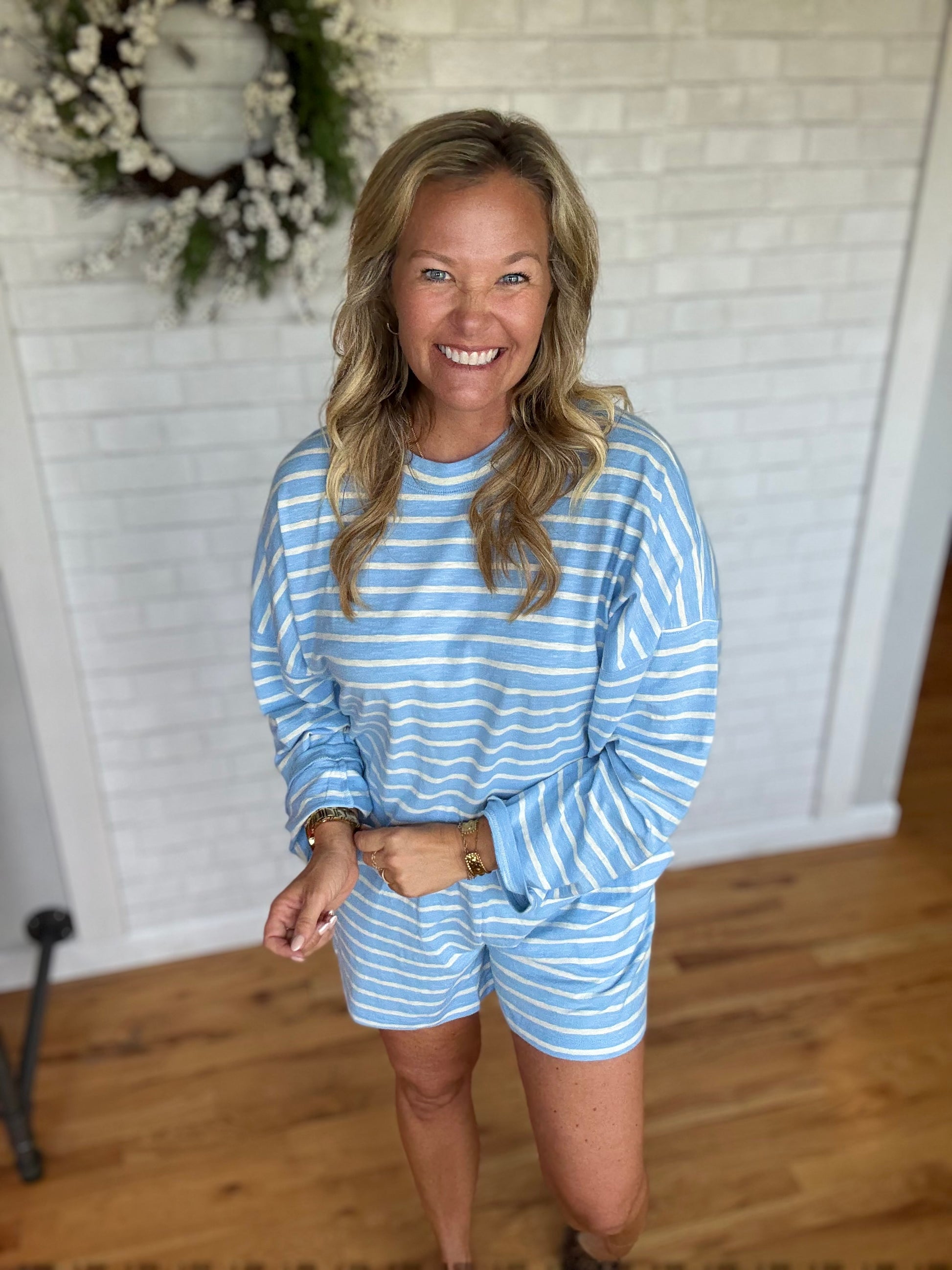 Knit Cotton Striped Mock Neck Drop Shoulder Long Sleeve Top