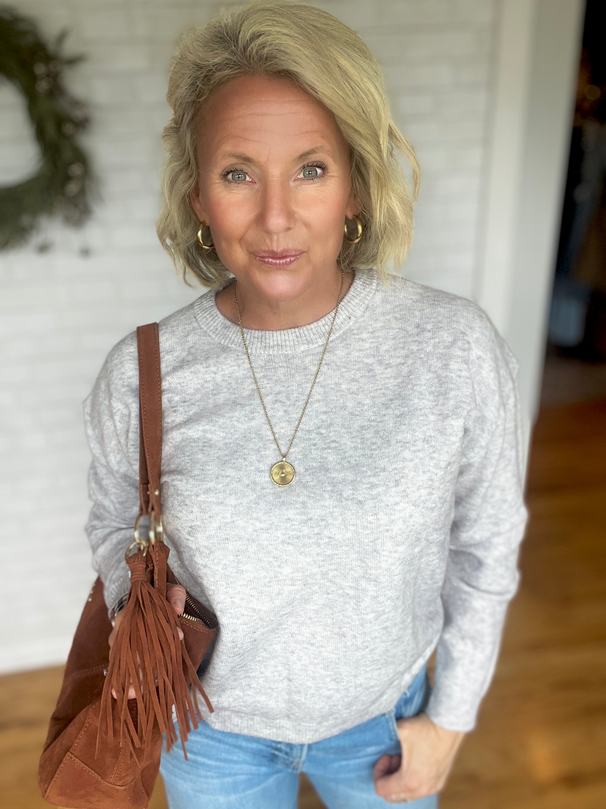 A heather grey sweater with ribbed detail on the collar, cuff, and hem. This one is a perfect simple yet classic style. Fit is true to size.